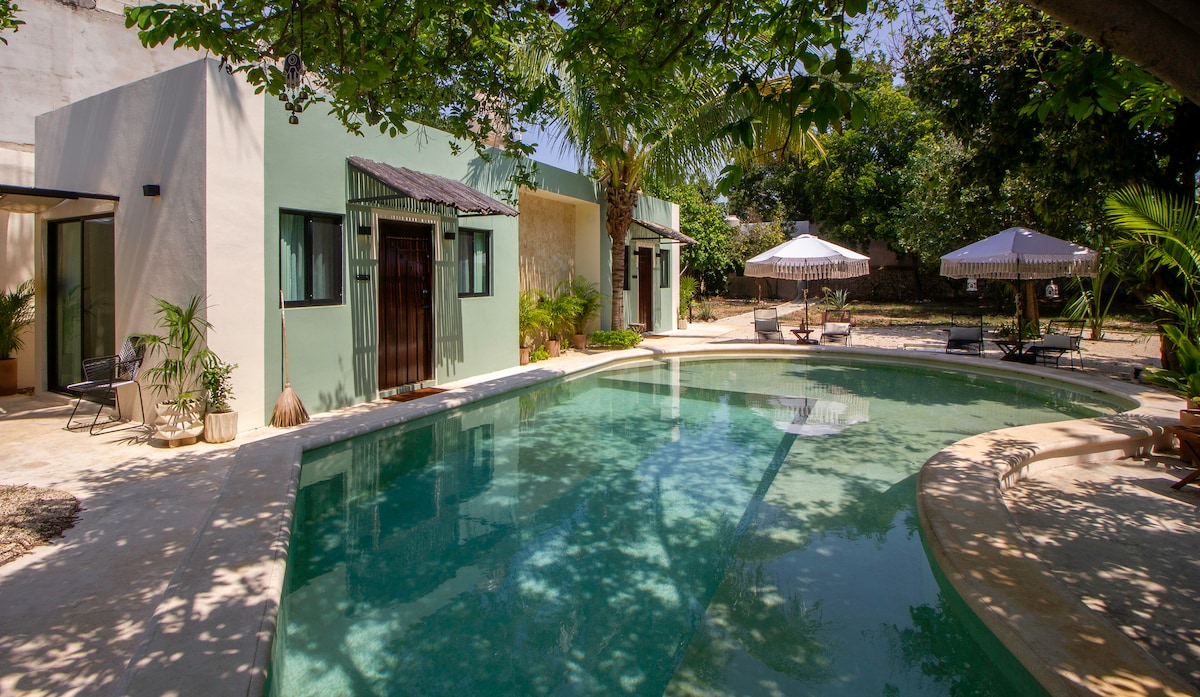 Maalaistyylinen talo pääasiallisen talon takana, luonnon ympäröimä (voit kohdata leguaanien, zarihueyojen, tulikärpästen jne.), suuria puita, rauhallinen alue, 1,7 km Yucatánin kansainvälisestä kongressikeskuksesta. Talossa on suuret ikkunat, joissa on hyttysverkot. Olemme lemmikkiystävällinen perhe. Päärakennuksessa meillä on kolme kissaa, jotka eivät mene taloon, jossa majoitut. Voit nauttia uima-altaasta ja grillausalueesta.