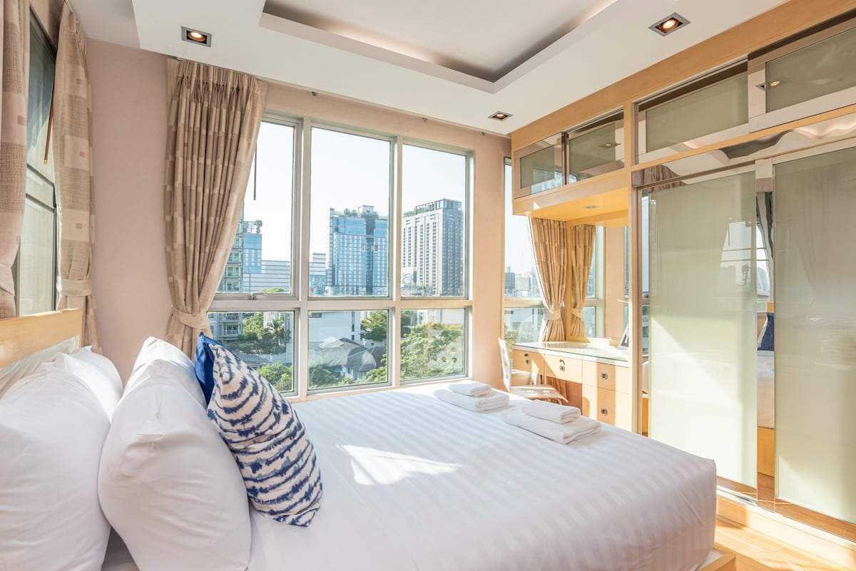 Keskimääräinen arvio 5/5, 14 arvosteluaCloseBTS–100+Mbs Wifi–Comfy Bed–Pool–NewApts–Gym