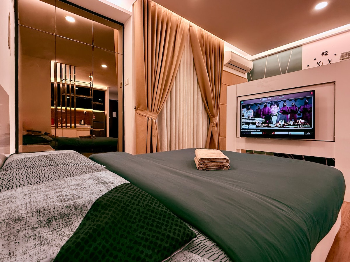 Grand Loftimme on täynnä kaikenlaisia mukavuuksia ja tiloja, joita tarvitset! Meillä on ensiluokkaiset huonekalut, viihdeyksikkö (karaoke) ja hieno viimeistely, joka antaa paitsi enemmän arvoa myös kokemuksen majoittumisesta täällä. Sijaintimme on vain 15 minuutin päässä CBD:stä, 5 pysäkin päässä Bukit Bintangista (Pavillion) ja 6 pysäkin päässä KLCC:stä junalla. Sijaintimme on strateginen, ja ostoskeskuksen kautta on 4 minuutin katettu kävelymatka MRT-asemalle tasolla 1