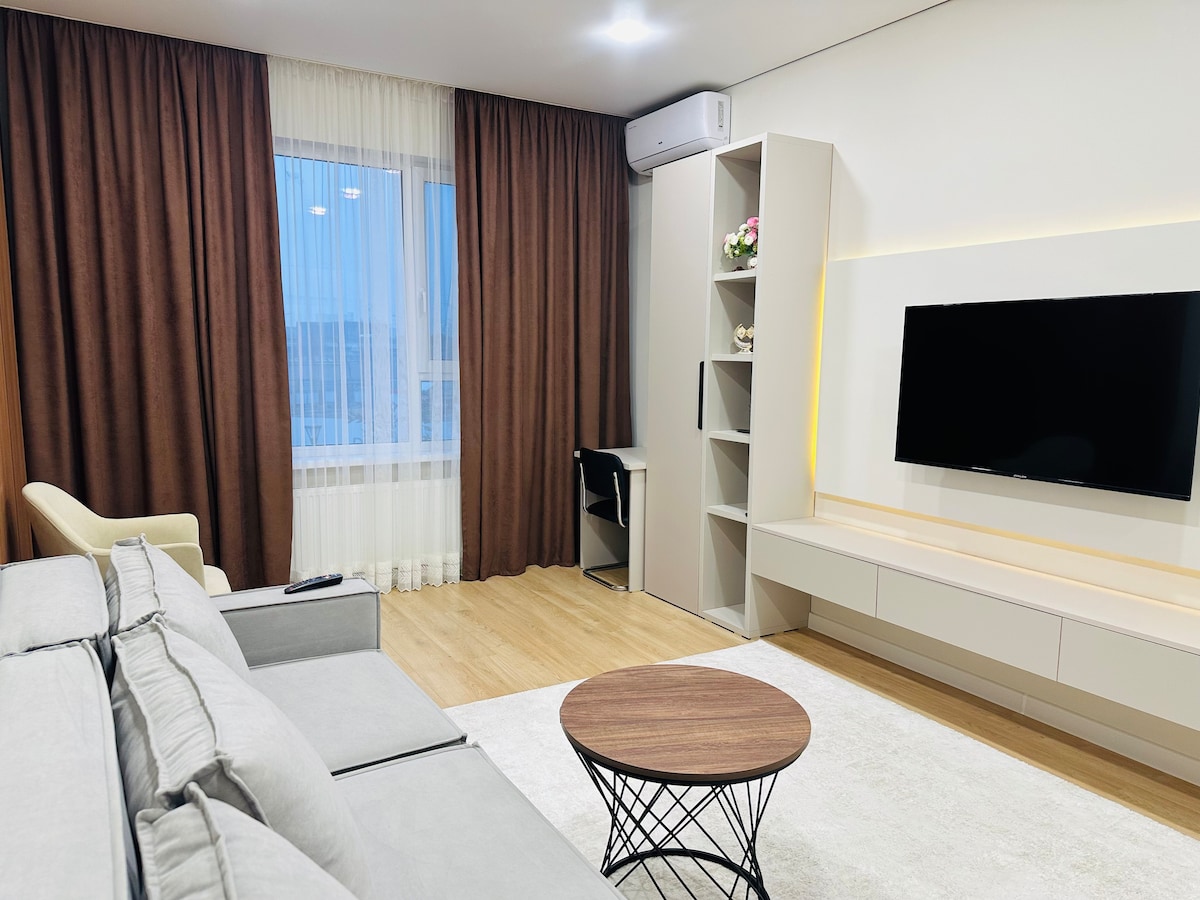 Стильная студия в новом здании Prestige Gardens, расположена в 5 минутах езды от аэропорта и Южного вокзала. - 1 двуспальная кровать - 1 раскладной диван - Свежий ремонт - Есть все для комфортного проживания: - WIFI, Smart TV -Холодильник, стиральная машина - Оборудованная кухня - Кондиционер, утюг, фен - Бесплатная парковка возле здания - Станция для зарядки электромобиля - Удобное расположение, до центра города 10 минут езды - Наличие ресторанов и супермаркетов поблизости