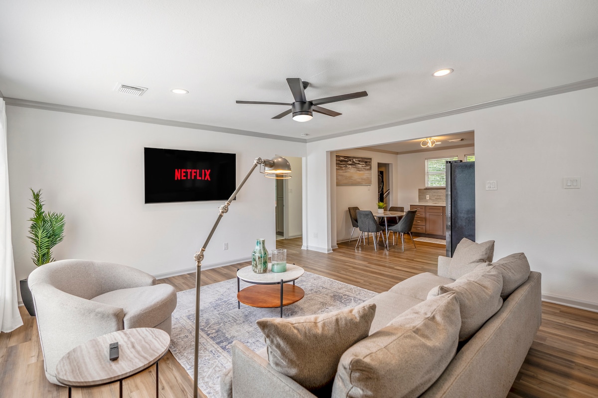 Yksityinen, rauhallinen ja puhdas vierasmaja, jossa on kaikki mitä tarvitset tilavassa, siistissä 65 neliömetrin tilassa. • Supermajoittajasi on siivonnut kohteen • Nopea Wi-Fi (532 Mbit/s) • Asuinyksikössä on pesukone/kuivain • Työtila • Täysin varusteltu keittiö välttämättömyystarvikkeilla • Erinomainen ilmastointi/lämmitys • Viihtyisä sohva ja nojatuoli • 55 tuuman älytelevisio, jossa on Hulu ja Disney+ • Yksityinen kylpyhuone ja suihku, jossa on välttämättömyystarvikkeita • Valaistut ulkoilmapuutarhat, joissa on rauhoittavia vesipiirteitä Täysin erillään päärakennuksesta Moderni upotettava LED-valaistus Midway Houston / Galveston