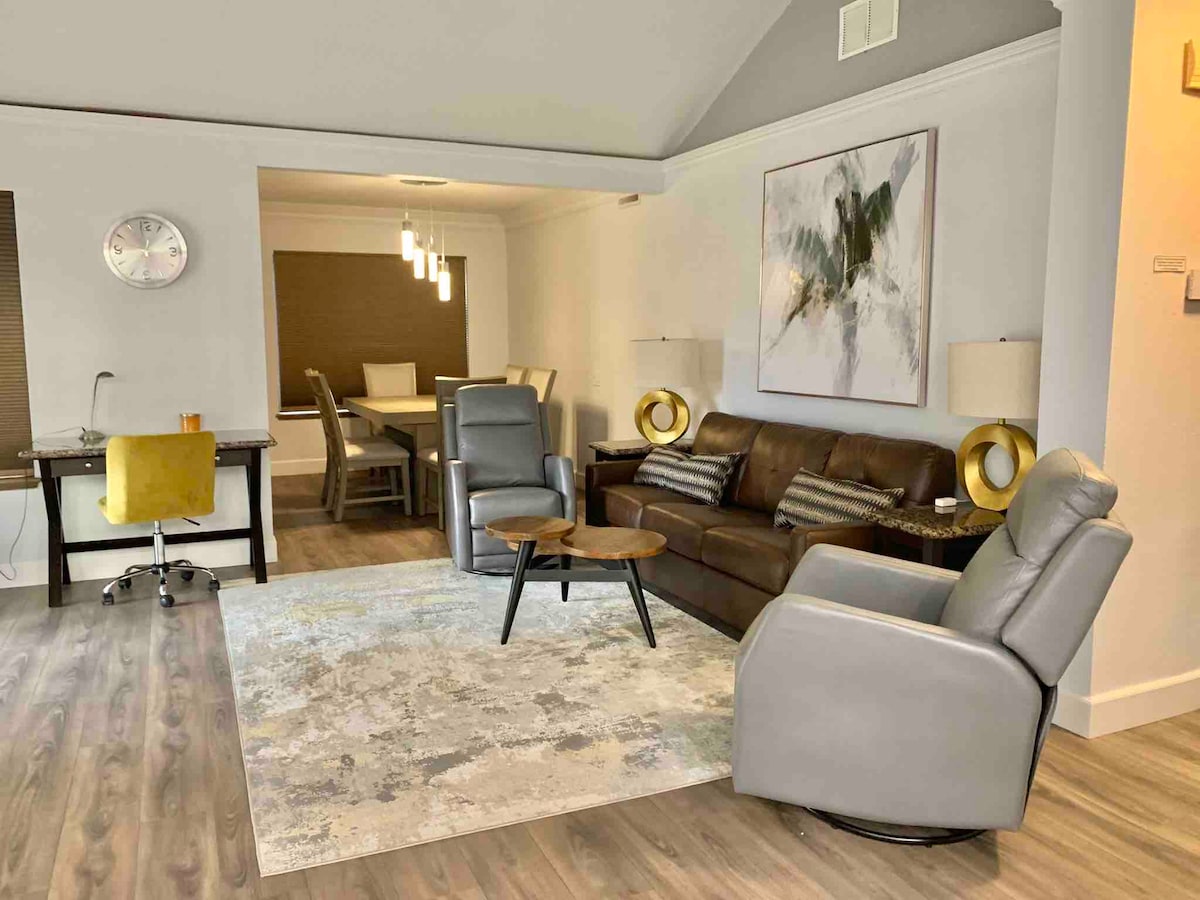 Värikäs, aavikko-aiheinen 2br/2ba alempi huoneistomme on valoisa, tilava ja kalustettu kaikella, mitä tarvitaan rentouttavaan lomaan. Hyvä wifi tarvittaessa Zoom-puheluihin! Yksi monista yhteisöllisistä uima-altaista/porealtaista sijaitsee muutaman askeleen päässä takaterassilta, ja sieltä on näkymät kauniille vihervyöhykkeelle, palmupuiden reunustamalle taivaalle ja peekaboon vuoristonäkymille, joista on upeat auringonlaskut. Tämä ei ole lemmikkieläinten omaisuutta. Meillä on myös Pack n Play & syöttötuoli yksikössä käytettäväksi.