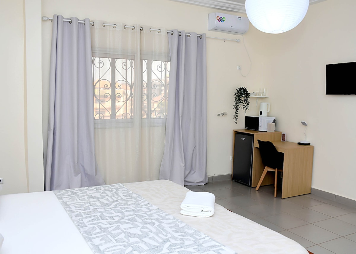Turvallinen asuinkompleksi, josta voit nauttia yksin tai koko perheen kanssa. Tämä luksushuoneisto sijaitsee Kipe, Conakryn keskustassa, vain muutaman minuutin päässä suosituista paikallisista nähtävyyksistä, kuten Prima Center, Lycee Francais ja Yhdysvaltain Guinean suurlähetystö. Noin 15 minuuttia lentokentältä. Nauti ensiluokkaisista mukavuuksistamme, kuten ympärivuorokautisesta WiFi-yhteydestä ja sähköstä, pesukoneesta ja kuivausrummusta tiloissa, kun rentoudut missä tahansa tyylikkäästi sisustetuissa huoneissamme, joissa on viihdejärjestelmä, joka tekee majoittumisestasi ikimuistoisen.