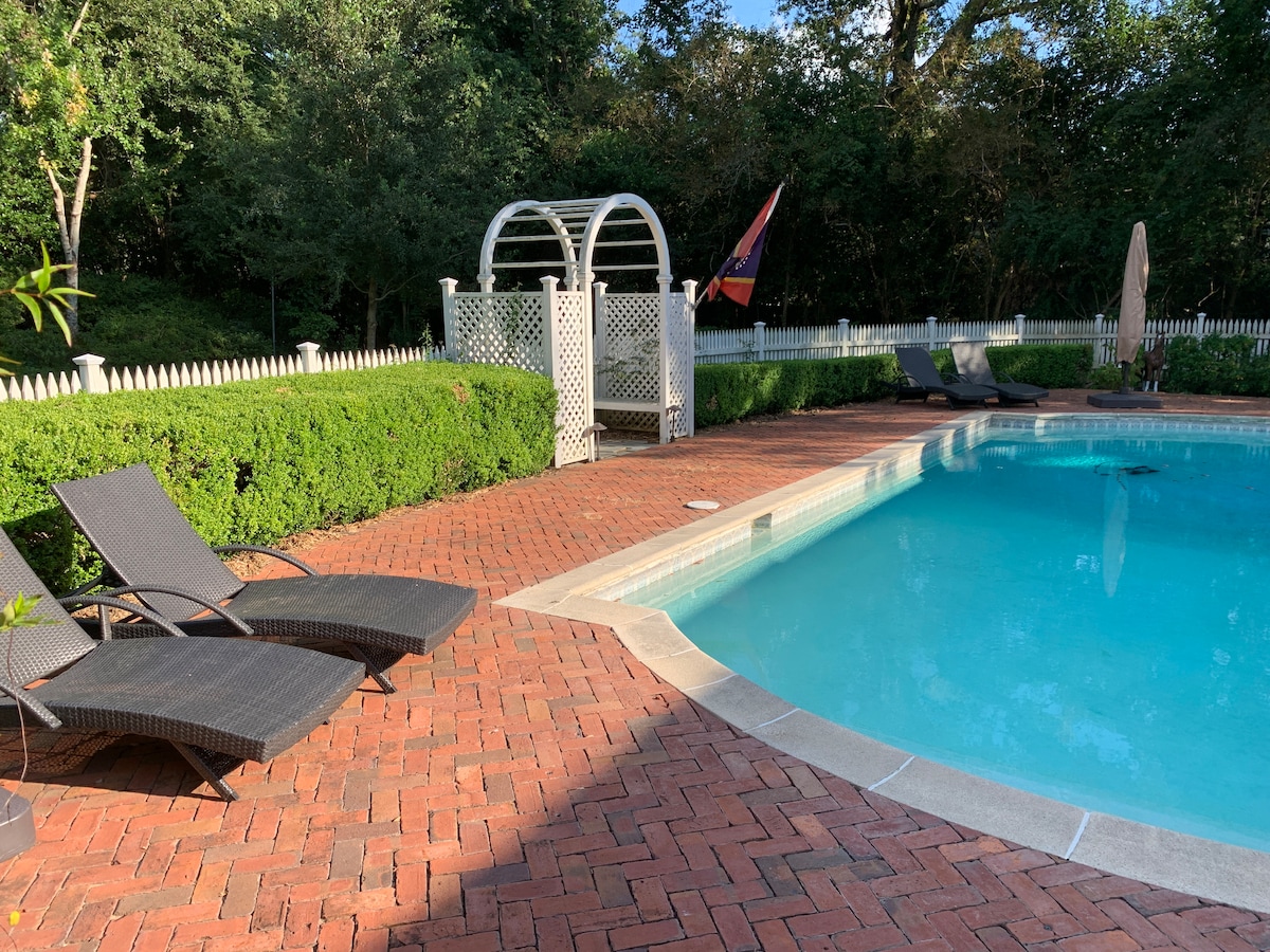 Avoin allastalo historiallisessa kohteessa, jossa on yksityinen uima-allas! Tämä ihana tiilinen uima-allasrakennus sijaitsee historiallisen Ravenna Antebellum Mansionin alueella, joka on rakennettu vuosina 1834–1836. Kohde sijaitsee viehättävässä yksityisyydessä epämuodollisten puutarhojen keskellä, jotka luovat maaseutumaisen tunnelman, samalla kun kohde sijaitsee kätevästi historiallisella alueella. Tämä kohde on kävelymatkan päässä keskustan ostospaikoista ja ravintoloista, Mississippijokeen ja moniin muihin historiallisiin kohteisiin.