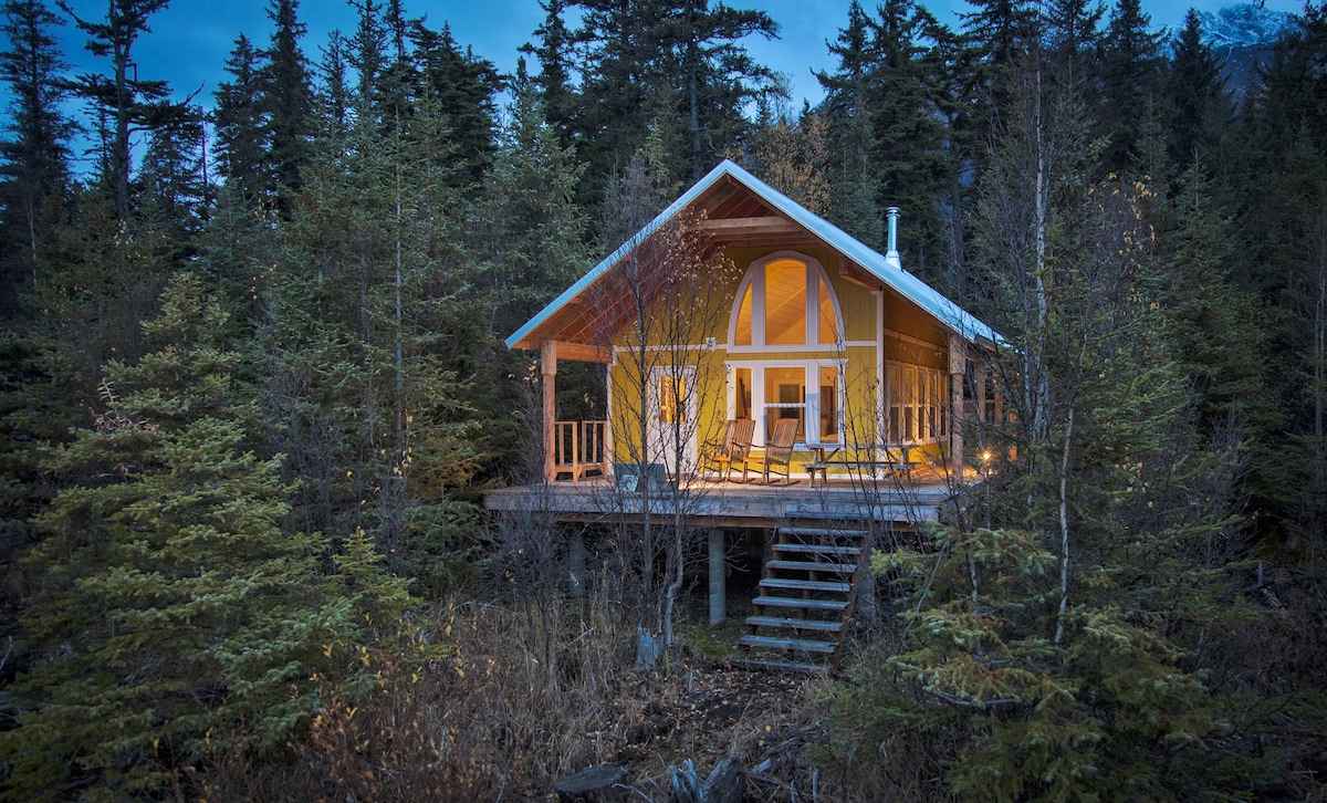 Tästä yksityisestä mökistä on näkymät, jotka saavat sinut hämmästymään! Pieni terassi ja valtavat ikkunat tuovat näkymän sisälle! Alaskan viehätys parhaimmillaan! Hyvin puhdas ja mukava! Monet vieraistamme kertovat meille, että tämä on ollut heidän suosikkinsa lomallaan! Täysin varustettu keittiö ja kylpyhuone, litteä satelliittitelevisio, WiFi; viihtyisä, mutta täydellinen! Paljon paikallistietoa, joka auttaa sinua millä tahansa tavalla ideoiden, ravintoloiden, aktiviteettien ja ohjeiden kanssa, ja joskus ihastuttavia husky-koiria, joiden kanssa voit leikkiä! Pyörävuokraus saatavilla kohteessa!