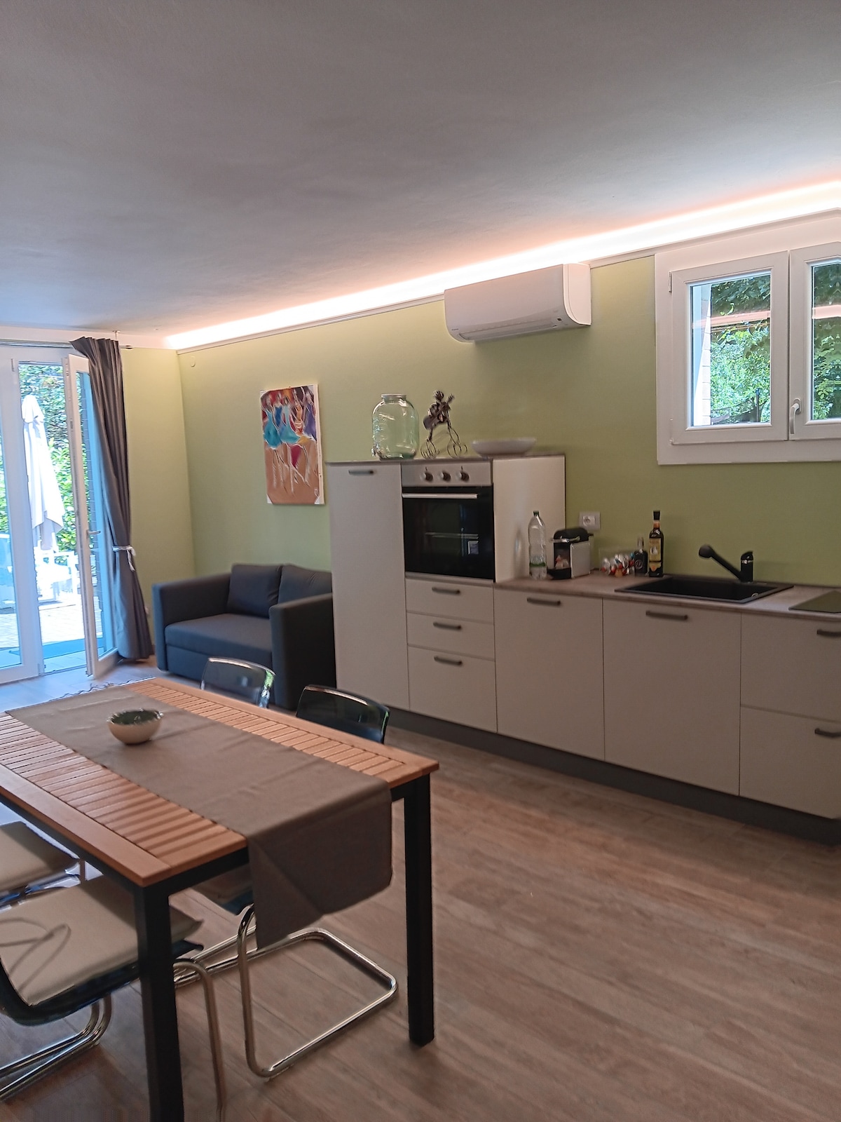 Noin 50 neliömetrin itsenäinen huoneisto, joka on juuri kunnostettu ja varustettu kaikilla mukavuuksilla (Nespresso-kahvinkeitin, mikroaaltouuni, älytelevisio, wifi, pesukone ja kuivain, ilmastointi ja hyttysverkot) Kyseessä on kahden erillisen huoneen huoneisto, jossa on sisäänkäynti keittiöön, ruokailutila ja rentoutumisnurkka kahdella nojatuolilla... ja sitten nukkuma-alue, jossa on suuri makuuhuone ja erittäin tilava kylpyhuone, jossa on kaikki mukavuudet, suihku 90x120, wc ja bidee