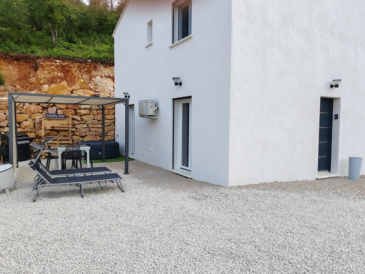Clos des Perles Tourtourissa, Viehättävä ja mukava yksiö, jossa on mahdollisuus kylpylähoitoon erillisessä huoneessa, johon on suora pääsy asunnosta. Muista varata 2,5 tunnin kylpyläaika, 60 euroa maksettavaksi paikan päällä kahdelle hengelle. Rauhallinen ja ihanteellisesti sijaitseva tässä kauniissa Haut-Varin kylässä, kylä taivaalla upealla panoraamanäkymällä. Voit nauttia lämmitetystä (kauden mukaan) uima-altaasta, jossa on uima-altaan reunan yli virtaava vesi, ja pienistä leikkitilaisuuksista (petankki, pöytätennis)