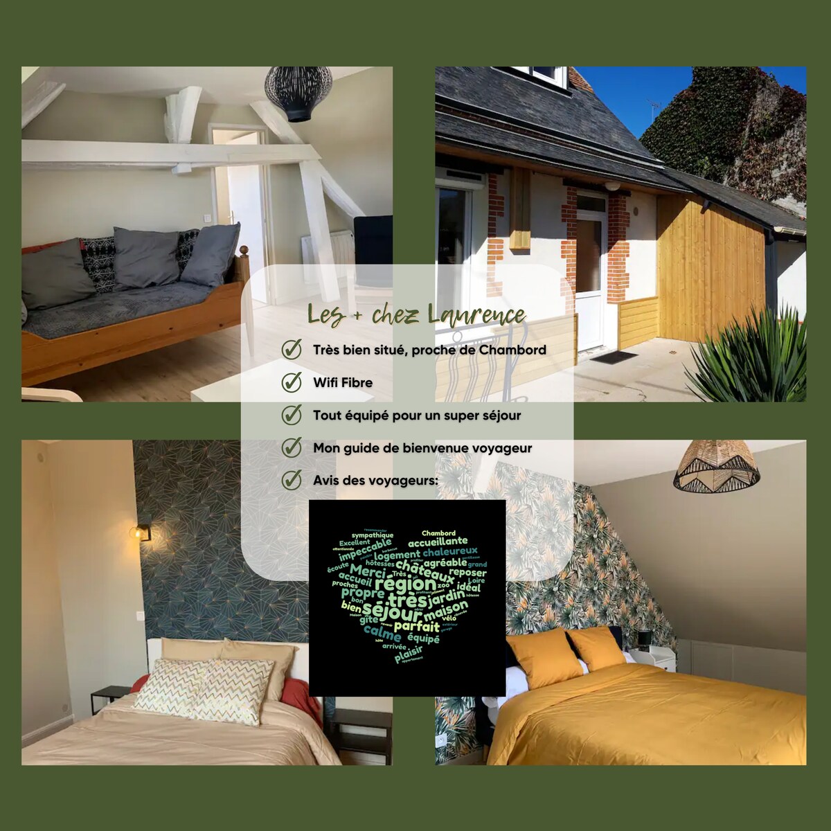 Talo vastapäätä Loirea, suuressa maisemapuutarhassa. Lähistöllä on kauppoja, leipomo, ruokakauppa, lihakauppa, tupakkakioski, ravintola 100 m, pikaruokaravintola 5 minuutin kävelymatkan päässä. Pyöräreittejä Chambordiin ja Blois'iin. Pyörävuokraamo 5 minuutin kävelymatkan päässä. Lähellä Loiren linnoja ja Beauvalin eläintarhaa. Kaikki mukavuudet on suunniteltu hyvinvointiasi varten. Lasten käytössä on puumaja ja leikkikenttä aikuisten valvonnassa.