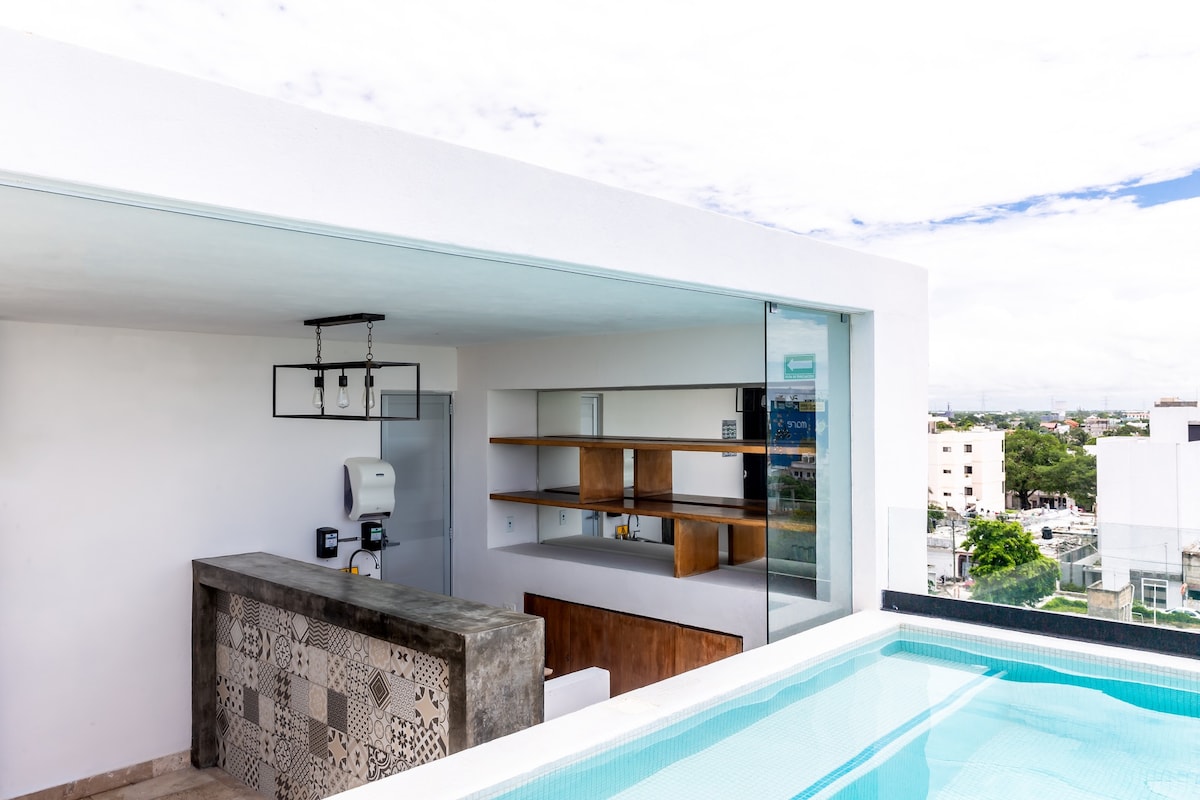 Mukava yksiö, jossa on parivuode, oma kylpyhuone, secapelo, keittiö, tuuletin, ilmastointi, TV, laatikko, internet ja aamiainen maanantaista lauantaihin. Jaettu uima-allas ja kattoalue. 2 korttelin päässä kauniista rannasta ja 3 korttelin päässä pääkadulta. Ihanteellinen niille, jotka haluavat vierailla todellisessa Meksikossa. Hiljainen naapurusto on vielä kehitteillä.