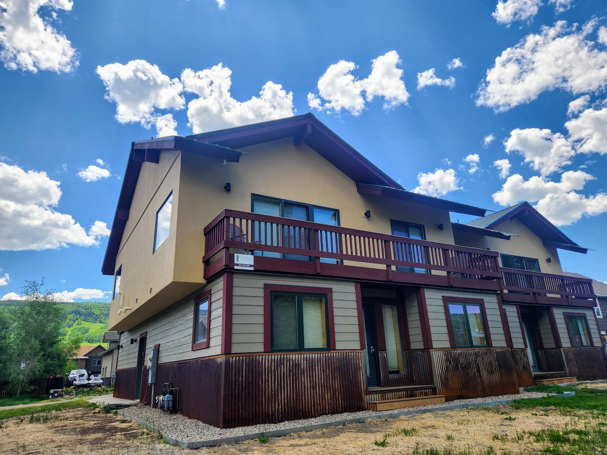 Tässä kaksikerroksisessa, kahden makuuhuoneen ja kahden kylpyhuoneen kulmayksikössä voi majoittua jopa 6 vierasta, ja se tuntuu enemmän kodilta kuin kaupunkitalolta tai condo-huoneistolta. Yksityinen tila tarjoaa kauniit, länteen päin olevat näkymät Crested Butten kaupunkiin Oh Be Joyful Range, Mount Emmons ja Red Lady Bowl. Valtavat ikkunat, aurinkoinen terassi, jossa on kotitekoisia Adirondack-hiihtotuoleja kesällä ja syksyllä, yksityinen nurmikko ja viihtyisä kaasutakka – täydellinen après ski -paikka ystävien ja perheen kanssa. Auringonlaskut ovat upeat.