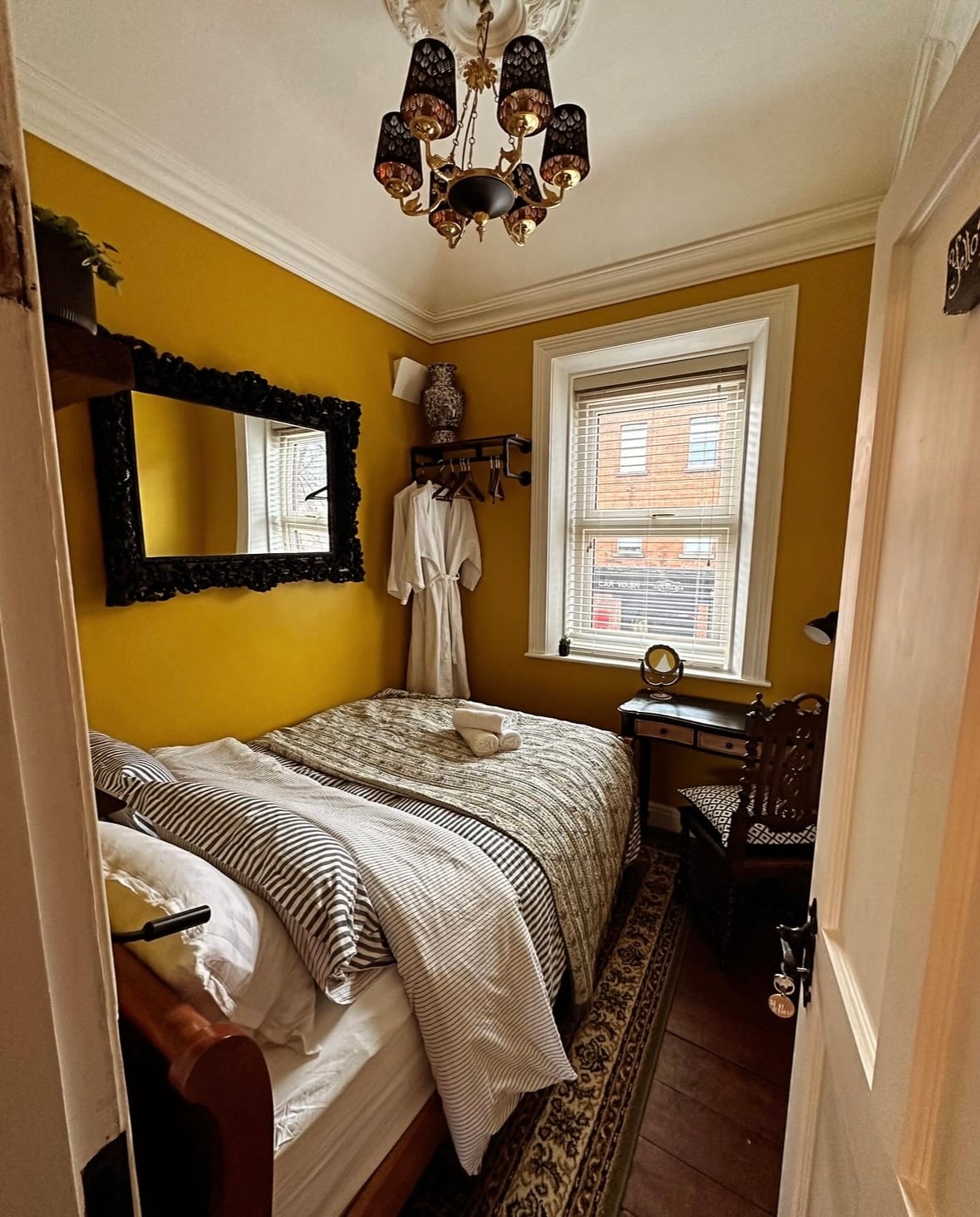Tässä historiallisessa talossa, joka on peräisin vuodelta 1774, on ylellinen laivastonsininen samettisohva, johon voit uppoutua mukavasti hyvän kirjan parissa. Tässä tyylikkäässä kodissa on monimutkaisia listoja, kauniita paneeleita ja upea veistetty puisen pylvässänky, jota ympäröi pehmeä salvia- ja kukkatapetti. Tämä upea 1700-luvun historiallinen talo on kunnostettu huolellisesti, ja sen historiallinen merkitys ja aito viehätys on säilynyt.