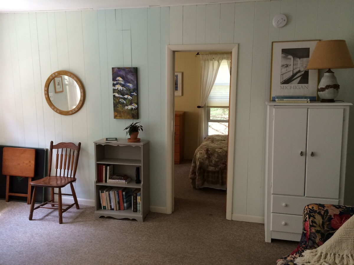 Helppo löytää, koska olemme aivan Frankfort Hwy. 3 mailin päässä Frankfortin keskustasta ja Michigan-järvestä, vain 8 minuutin kävelymatkan päässä Crystal Lake -järvestä. Nauti pyöräilystä, olemme alle kilometrin päässä päällystetystä pyöräreitistä/raiteista poluille, 15 mailin päässä Crystal Mnt:stä. Kun saavut mökkiisi, voit nauttia uudesta memory foam -patjasta, queen-size-vuoteesta yksityisessä studio-mökissä. Mökissä on keittiö, kylpyhuone, ilmastointi ja ilmainen nopea wifi! Puhtaat liinavaatteet, pyyhkeet, kattilat/paistinpannut, astiat/ruokailuvälineet.
