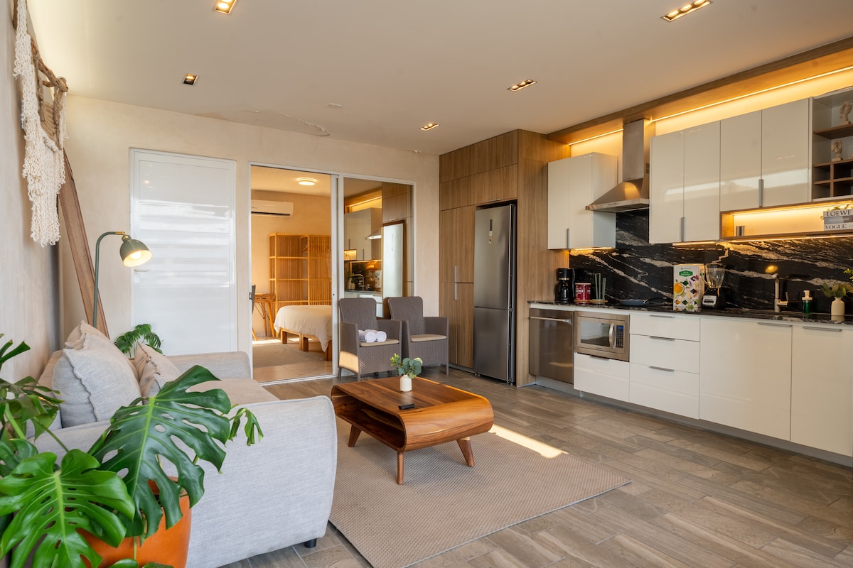 Suite Tamarindo on erillinen yksikkö, jossa on maaseinät, tilava sisä- ja ulkokylpyhuone, työalue, suuri komero ja vaate ja kaksi yhden hengen vuodetta, jotka voidaan siirtää vierekkäin muodostamaan king-vuode, joka edistää rauhallisempaa nukkumista kuin täysin jaettu vuode. Suunnittelimme suuren osan kiinteistöstä hyödyntämään passiivista jäähdytystä kestävyyttä silmällä pitäen, joten tämä sviitti pysyy ihanan viileänä. Siinä on kattotuuletin, joka pitää sen raikkaana ja ilmavana lämpimimpien kuukausien aikana.