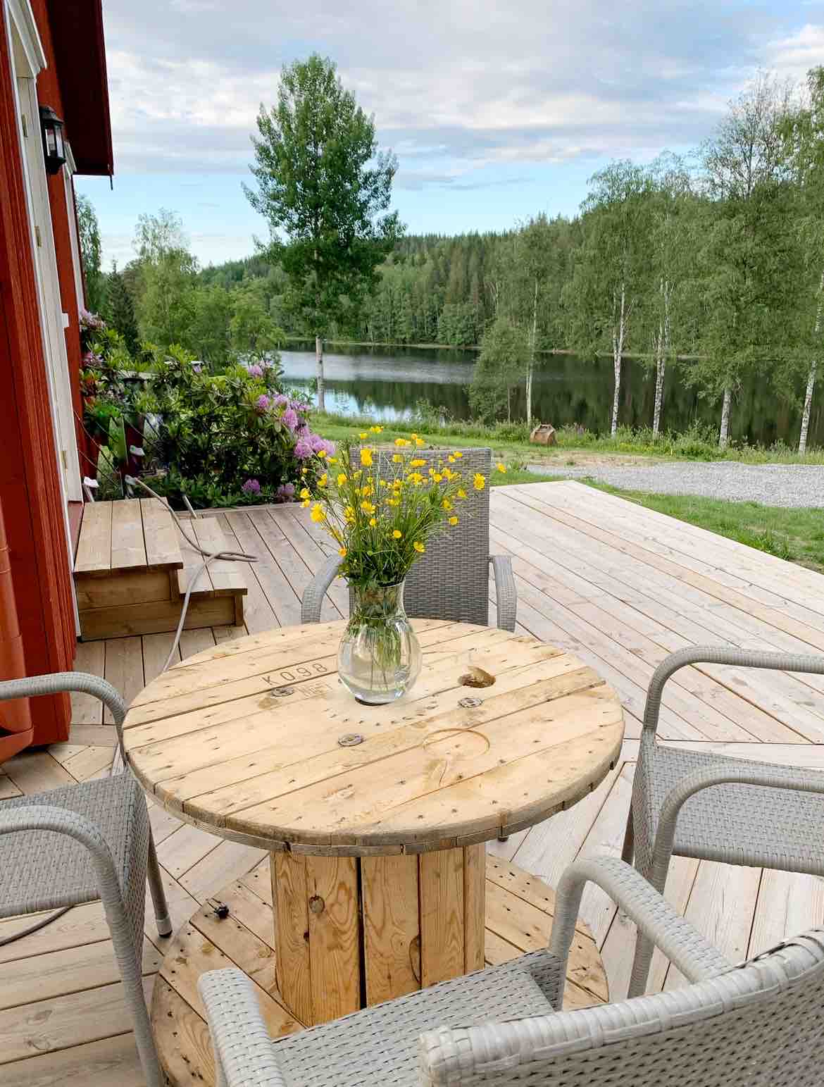 Mökki, josta on näkymä veneellä järvelle, ja hyvät vaellusreitit