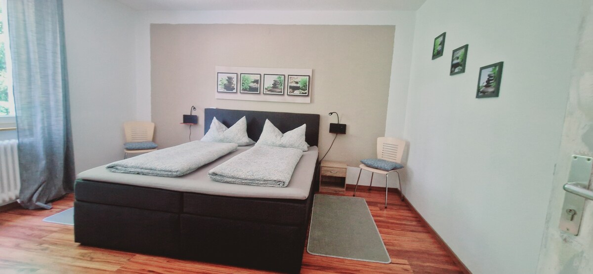 Schöne ruhige Ferienwohnung ( 1.Etage ) 1 Schlafzimmer mit Doppelbett, 1 Zimmer mit 2 Einzelbetten, Wohnküche kopl. ( o.Spülmaschine ,),Badezimmer mit großzügiger Eckbadewanne, gemütliches Wohnzimmer mit Sat TV , und ein Spielezimmer mit Dart und Minikicker, und Spielzeug für die Kinder. Terrasse im EG, Sat-Anlage.Da auf dem Land Wlan schon mal mit Störung. Kaminofen - keine Nutzung Nur als Dekoratione. 1 Kleinkind bis 24 Monate frei Haustiere sind nicht möglich.