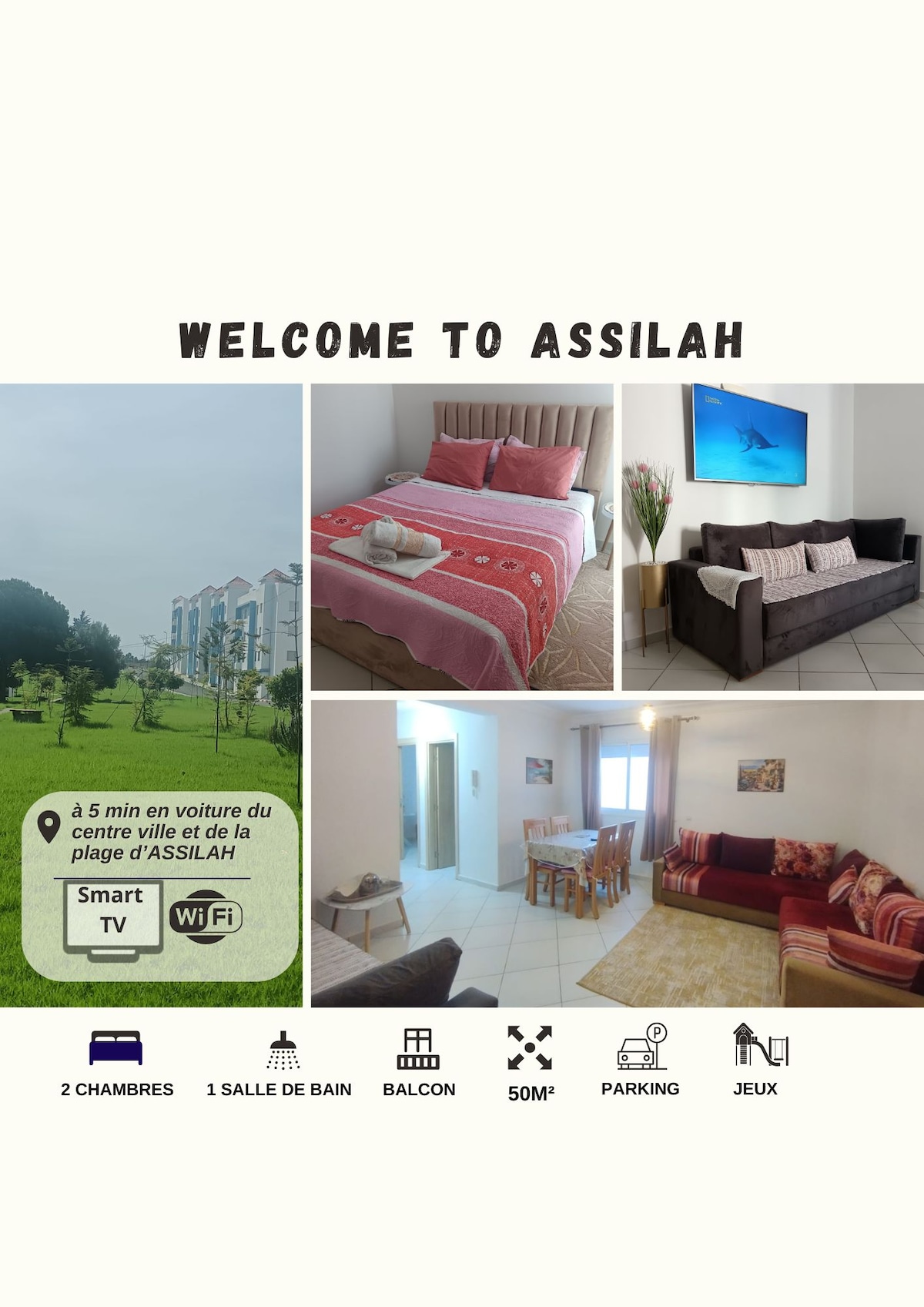 a quiet and de-stressing place with a touch of nature, Welcome to our 2 bedroom aprt in assilah : - in 2d floor,500 m from highway A5, 5 min to the center and beach, - tow pools, -watch your children in the pool from the balcony; - mobile wifi routeur;android TV 55, -2 spacious rooms + 3 beds one for baby; - fully equipped kitchen with electric stove; - can host up to 6 guests + 1 bed for baby; - 24/7 security+ free parking; - grocery store inside -maintained garden - children's play area