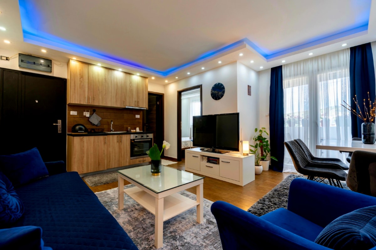 Viihtyisä ja upouusi yhden makuuhuoneen huoneisto, ihanteellinen liikematkailuun ja huvimatkailuun, lähellä Montenegron pääkaupungin tärkeimpiä keskustan paikkoja. Tyylikäs ja hyvin varusteltu huoneisto, jossa on parivuode ja yksi ylimääräinen vuodesohva. Se sijaitsee 20 minuutin kävelymatkan päässa kaupungin keskustan pääaukiolta, 1,6 km päässä pääbussi-/rautatieasemalta, 11 minuutin ajomatkan päässä lentokentältä ja 1 tunnin ajomatkan päässä rannalta.