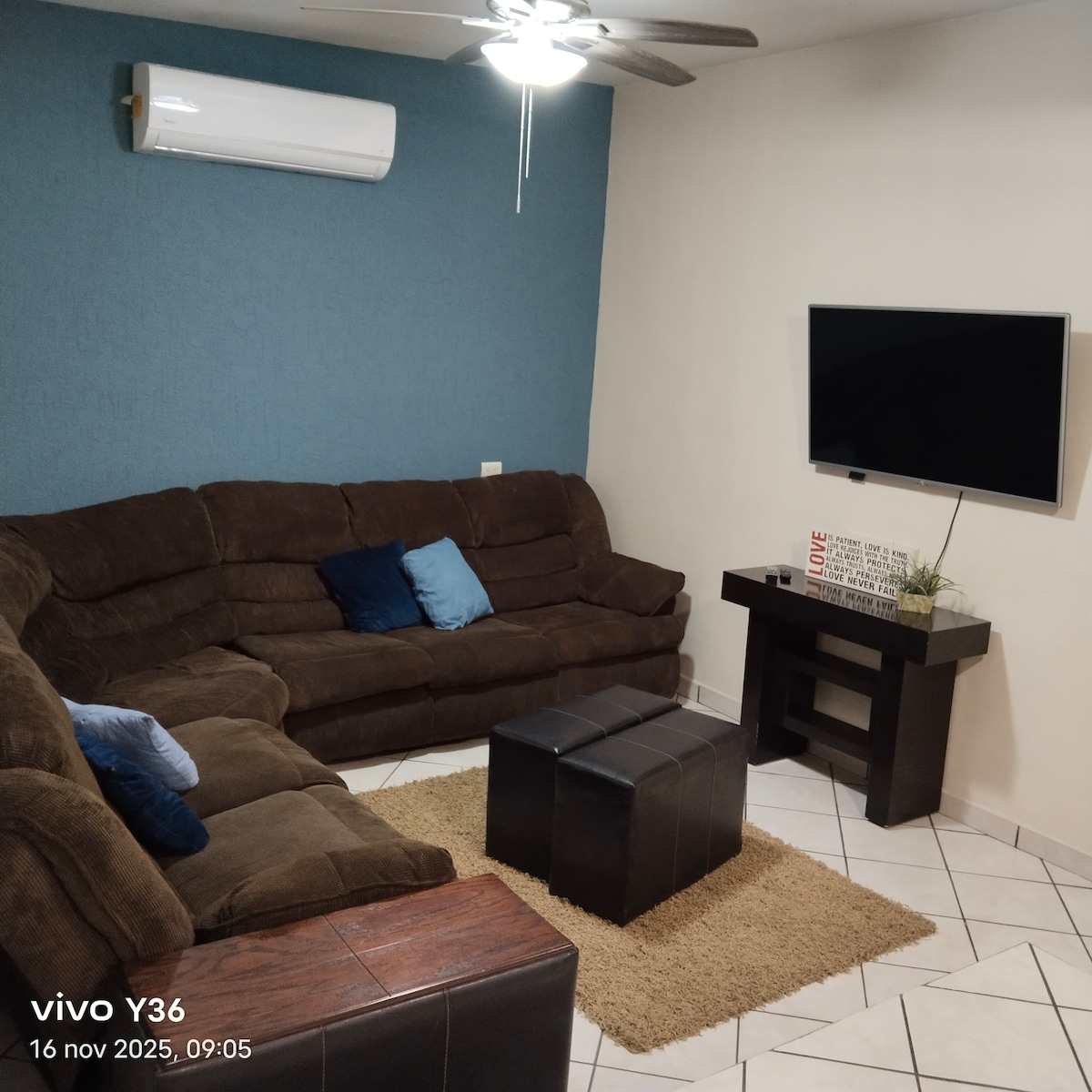 Your family will be close to everything if you stay in this accommodation with an excellent location, one block from the main hospitals including the IMSS clinic 11, close to government offices, convenience stores and the city center. This cute and cozy brand new apartment, is for 5 people, with 2 bedrooms, a sofa bed in the living room and a full bathroom. It has an equipped kitchen and a generous patio with a barbecue in case you like to have a meal outside.