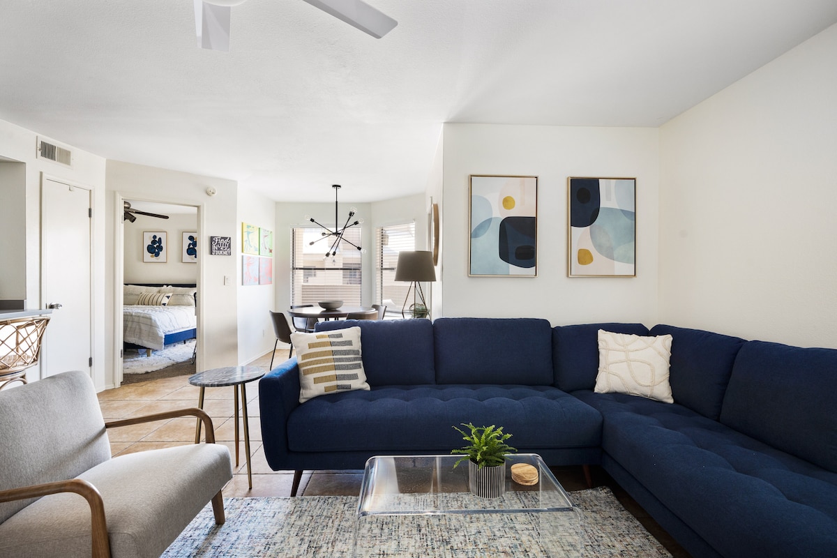 Tervetuloa moderniin kahden makuuhuoneen asuntoon Kierland Commonsin ja Scottsdale Quarterin lähellä Pohjois-Scottsdalessa. Rentoudu patiolla, ui lämmitetyssä uima-altaassa, nauti porealtaasta tai käy kohteessa sijaitsevalla kuntosalilla. King-vuode isossa makuuhuoneessa + queen-vuode toisessa makuuhuoneessa Nopea WiFi ja 3 älytelevisiota täydellä Fubo-tilauksella Täysin varustettu keittiö ja pesukone/kuivausrumpu Ilmainen pysäköinti, avaimeton sisäänpääsy Perheet tervetulleita – leikkikehä ja kannettava syöttötuoli saatavilla pyynnöstä. Varaa majoittumisesi tänään!