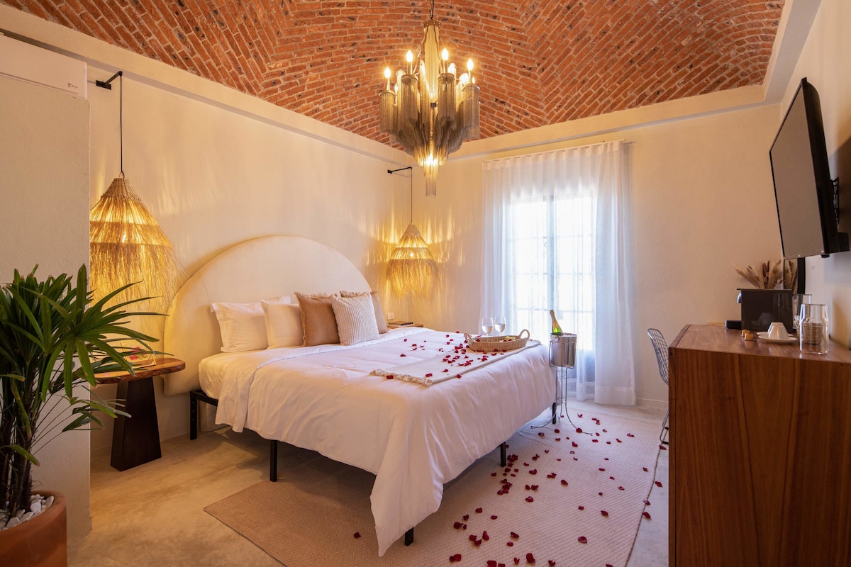 Vain AirBnb: llä, paras huone, ilmainen sviitti - - Muutaman askeleen päässä "Chorrosta" ja Benito Juarezin puistosta ja muutaman minuutin kävelymatkan päässä pääpuutarhasta - San Miguelin kansanperinnekokoelman paras edustaja - Viehättäviä puutarhoja ja romanttisia terasseja - Jokaisessa huoneessa on tarina kerrottavana. - Täydellinen romanttiselle lomalle tai perheelle. - Oma pysäköinti hotellin sisällä. - Plaza de Toros de San Miguelia lähimpänä