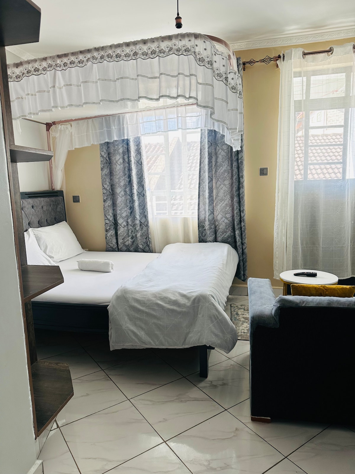 Tervetuloa viihtyisään ja tyylikkääseen studiohuoneistoomme Fedhassa, Nairobissa, joka on ihanteellinen lyhyille välilaskuille ja pidemmille majoittumisille. Sijaitsee vain 13 km: n päässä JKIA: sta, 10 km: n päässä SGR: ltä, ja sieltä on helppo pääsy moottoritielle. Se tarjoaa mukavuutta ja kätevyyttä. Auringon täyttämä tila, jossa on länteen päin oleva ikkuna, luo lämpimän ilmapiirin. Voit kirjautua sisään itse jopa myöhään yöllä avainlaatikon avulla. Asunnossa on ympärivuorokautinen turvallisuus. Nauti kuppi aitoa kenialaista teetä. Arvostan suuresti monimuotoisuutta ja kunnioitusta kaikkia kohtaan. Karibu Sana!