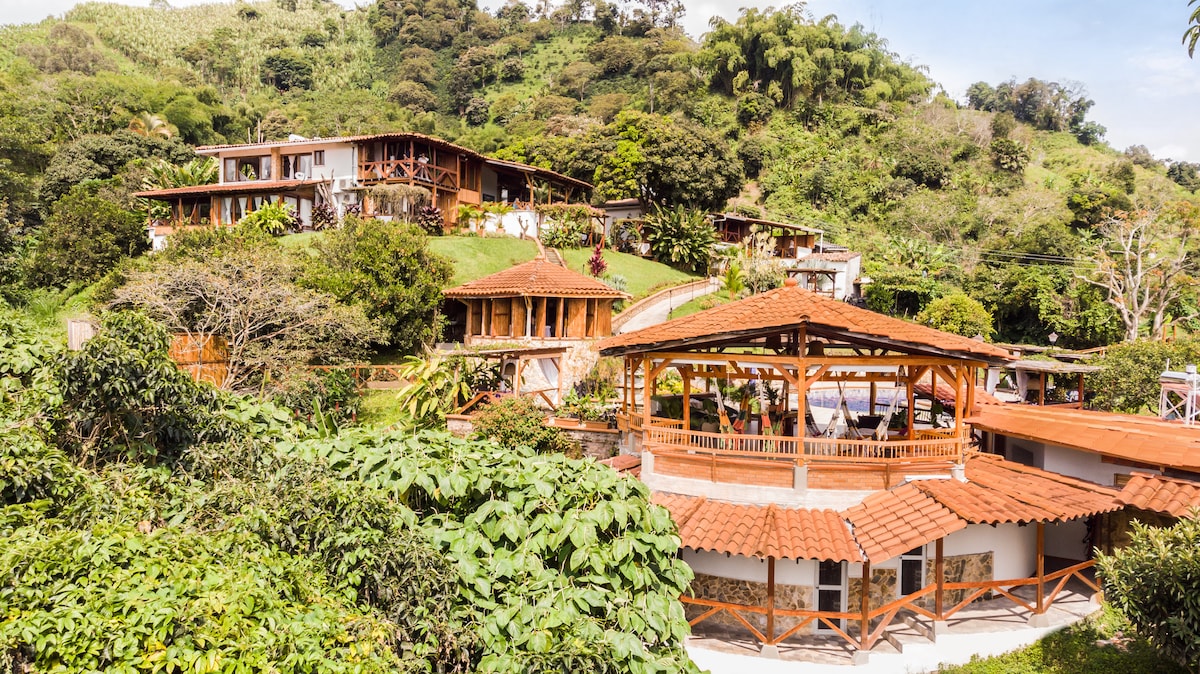 Bienvenidos a nuestro oasis ecológico en Santa Rosa de Cabal. Con nuestras cabañas rodeadas de montañas y cafetales, te sumergirás en un ambiente tranquilo y natural. Disfruta de vistas espectaculares desde nuestro mirador del paisaje cafetero, relájate en nuestras hamacas o sumérgete en nuestro jacuzzi. Si eres un amante del deporte, también contamos con una cancha de fútbol y polideportivo. ¡Y no te preocupes por el desayuno, está incluido! Reserva ahora y vive la experiencia.