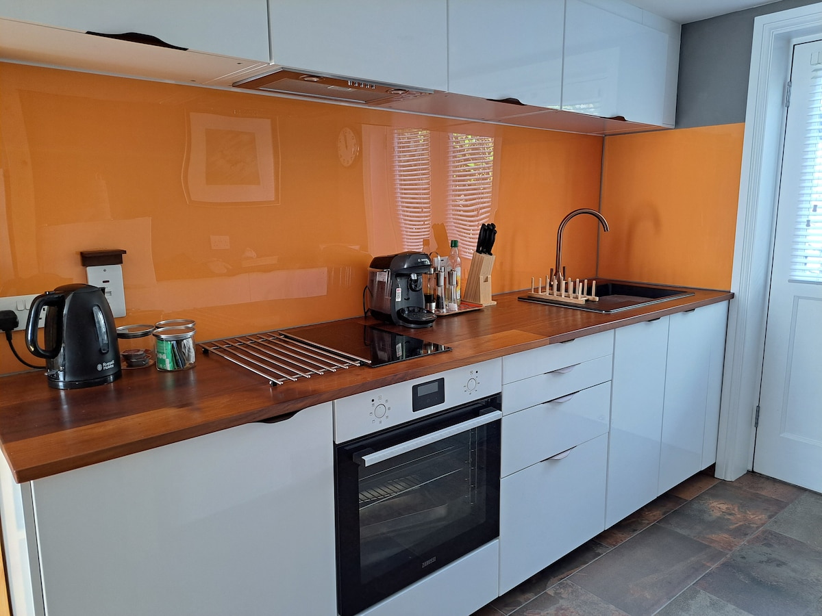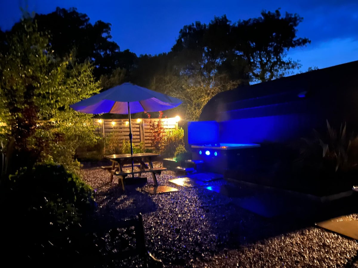 Erillinen, tilava mökki, jossa on yksityiset puutarhat ja pysäköinti, täysin varustettu keittiö, nopea wifi, grillaus, pelloja, joilla voi kävellä, ja poreallas, josta voi nauttia tähtitaivaan alla. Lattialämmitys ja puupoltin pitävät sinut mukavana. Yhdessä kylpyhuoneessa on poreallas, jossa on suihku. Toisessa makuuhuoneessa on suihkutila. Kaksi makuuhuonetta: päämakuuhuone, jossa on 6 jalan leveä superking-vuode ja oma kylpyhuone, toinen makuuhuone, jossa on kaksi yhden hengen vuodetta tai yksi superking-vuode. Koirat ovat tervetulleita, mutta valitettavasti korkeintaan kaksi.
