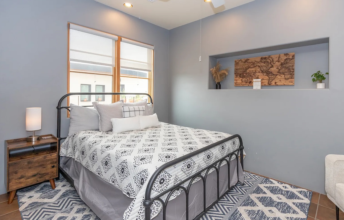 Upea Studio Casita! Räätälöity uusi rakennus, jossa on avoin pohjaratkaisu, kirkas ja viihtyisä ja ihana, kävelyä suosiva, keskustan Tucsonin naapurusto. Kävelymatkan päässä vuorelta, liitteenä, Mercado San Agustin, raitiovaunu, Loop-pyöräreitti, UofA Campus 2,5 mailia, taide- ja musiikkipaikat, Saguaro National Park, ravintolat ja yöelämä. - kylpylälattiat – Korkeat katot, joissa on palkit - Ylellinen keittiö kvartsitasoilla -A/C - Queen-vuode - Älytelevisio - WIFI - pesukone/kuivausrumpu - Aidattu piha - lemmikkiystävällinen
