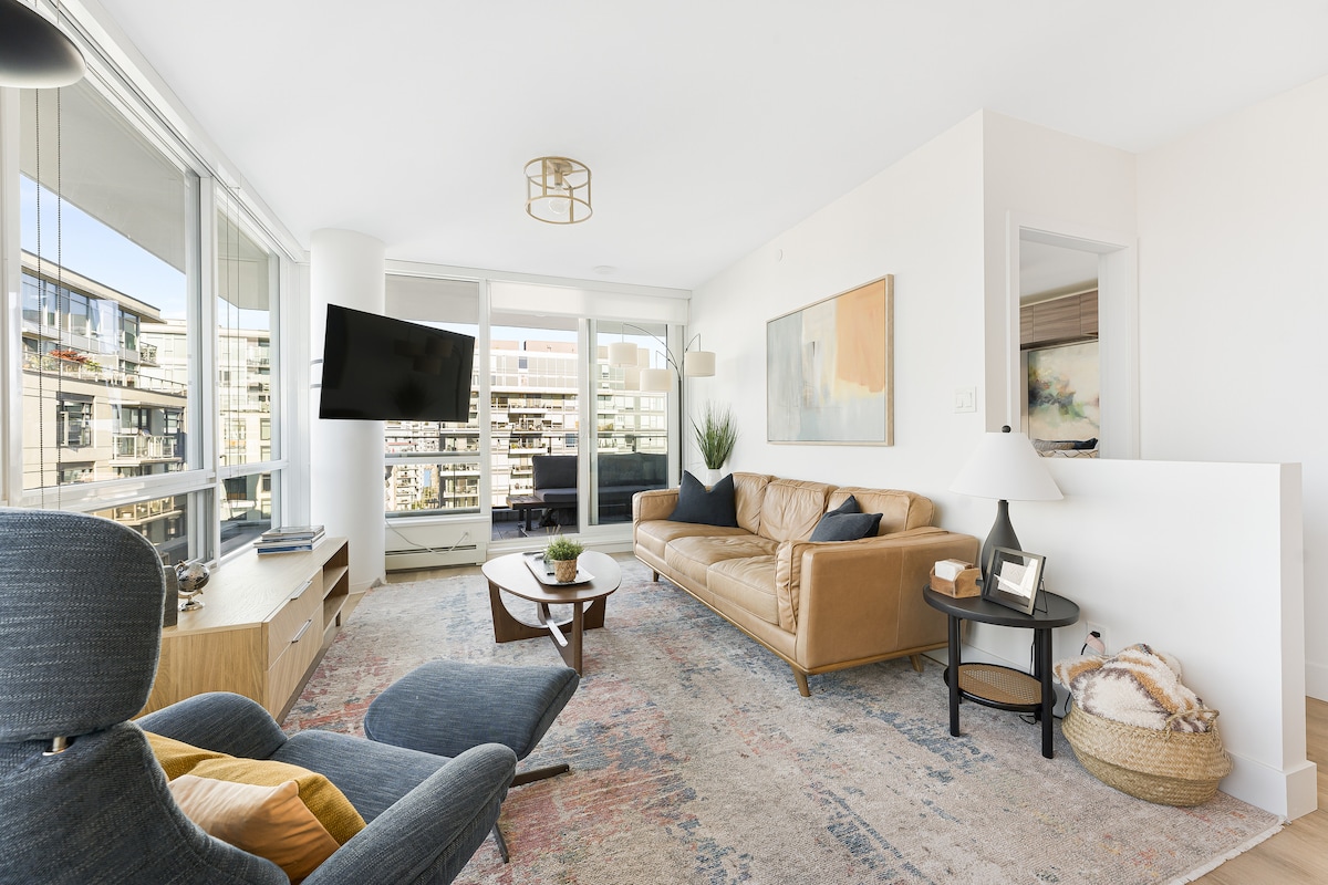 Tervetuloa Beach Avenuen kiistattomaan helmeen pariin. Tämä äskettäin remontoitu skandinaavinen keidas on rakennuksen suurin asunto, ja se tarjoaa harvinaisen mahdollisuuden paeta kaupungin hälinää. Se on **ainoa** huoneisto, jossa on valtava, noin 60 neliömetrin yksityinen terassi, jolla on tulisija, ulkoruokailutila ja oleskelutiloja, joista on näkymä Granville Islandille. Sisällä voit nauttia yksilöllisestä ”Hygge”-puutyöstä, ylellisestä päämakuuhuoneesta, jossa on king-vuode, kahdesta makuuhuoneesta, joissa on queen-vuoteet, ja kahdesta upouudesta kylpyhuoneesta, joissa on poreamme. Muutaman askeleen päässä Seawallista, todella ainutlaatuisesta keskustasta.