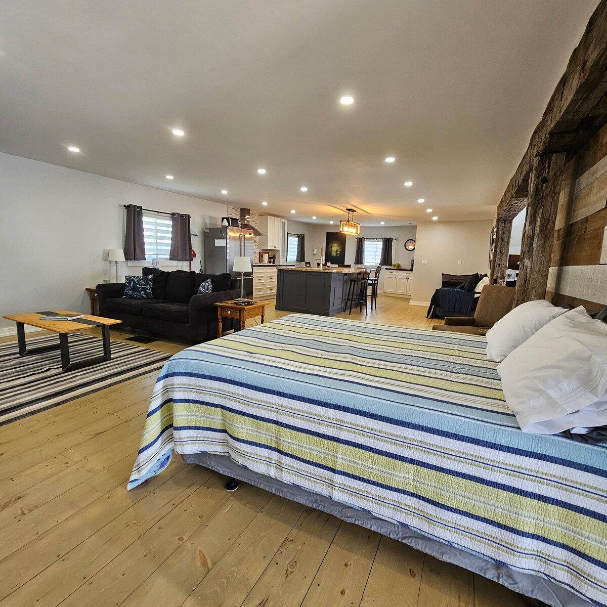 LUE! Mt. St. Louis & Horseshoe Valley aivan lähellä! Tämä on valoisa, suuri ja yksityinen uloskäynnillä varustettu VIERASHUONEISTO (kellarihuoneisto). Poreallas, terassi, nuotiopaikka ja syrjäinen polku metsässä luonnosta nauttimiseen. Keittiössä on induktioliesi ja kaikki tarvittava, jopa viinipullonavaaja :) Avoin olohuone/keittiö/ruokailuhuone, jossa on TV ja Roku. Makuuhuone on taideteos: tumma, salaperäinen ja romanttinen! Mukautettu queen-vuode, joka on valmistettu säältä kärsineestä navetapuusta, joka on pelastettu kiinteistöltämme.