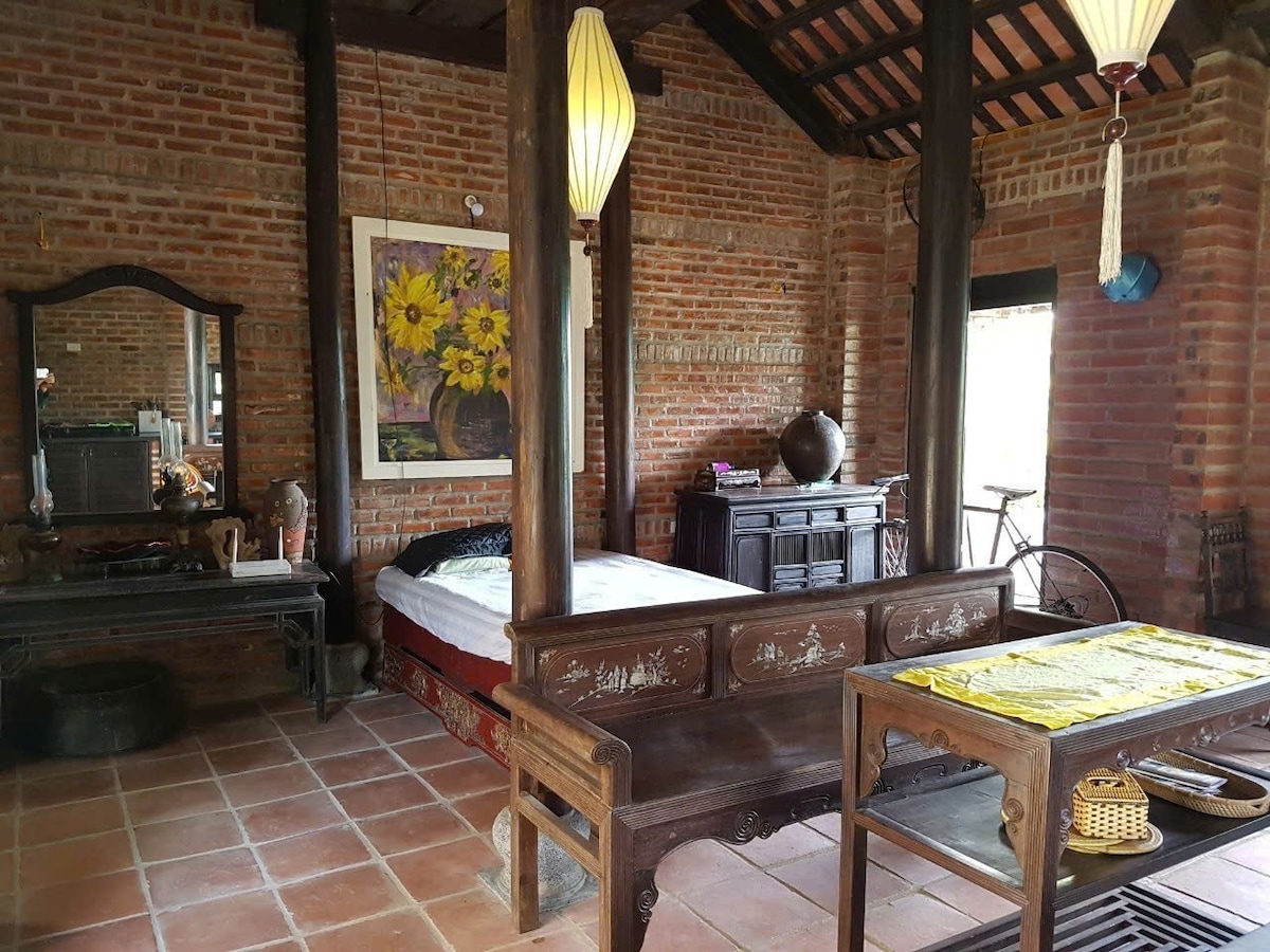 The architecture is dominated by rustic red brick and dark, sturdy wooden pillars, evoking the elegance of traditional Vietnamese homes. Inside, the design features simple yet sophisticated antique wooden furniture, including classic carved daybeds and tables, all set against the backdrop of the exposed brick walls and terracotta tiled floors. Outside, the villa opens up to a tranquil coconut garden, offering a peaceful retreat from the city buzz.
