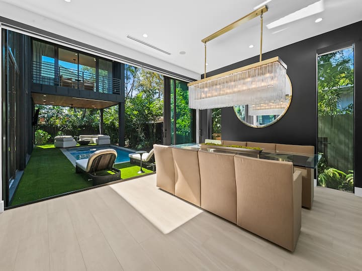 Airbnb logo paired with Art Basel Miami Beach logo, promoting accommodations near the 2025 art fair
