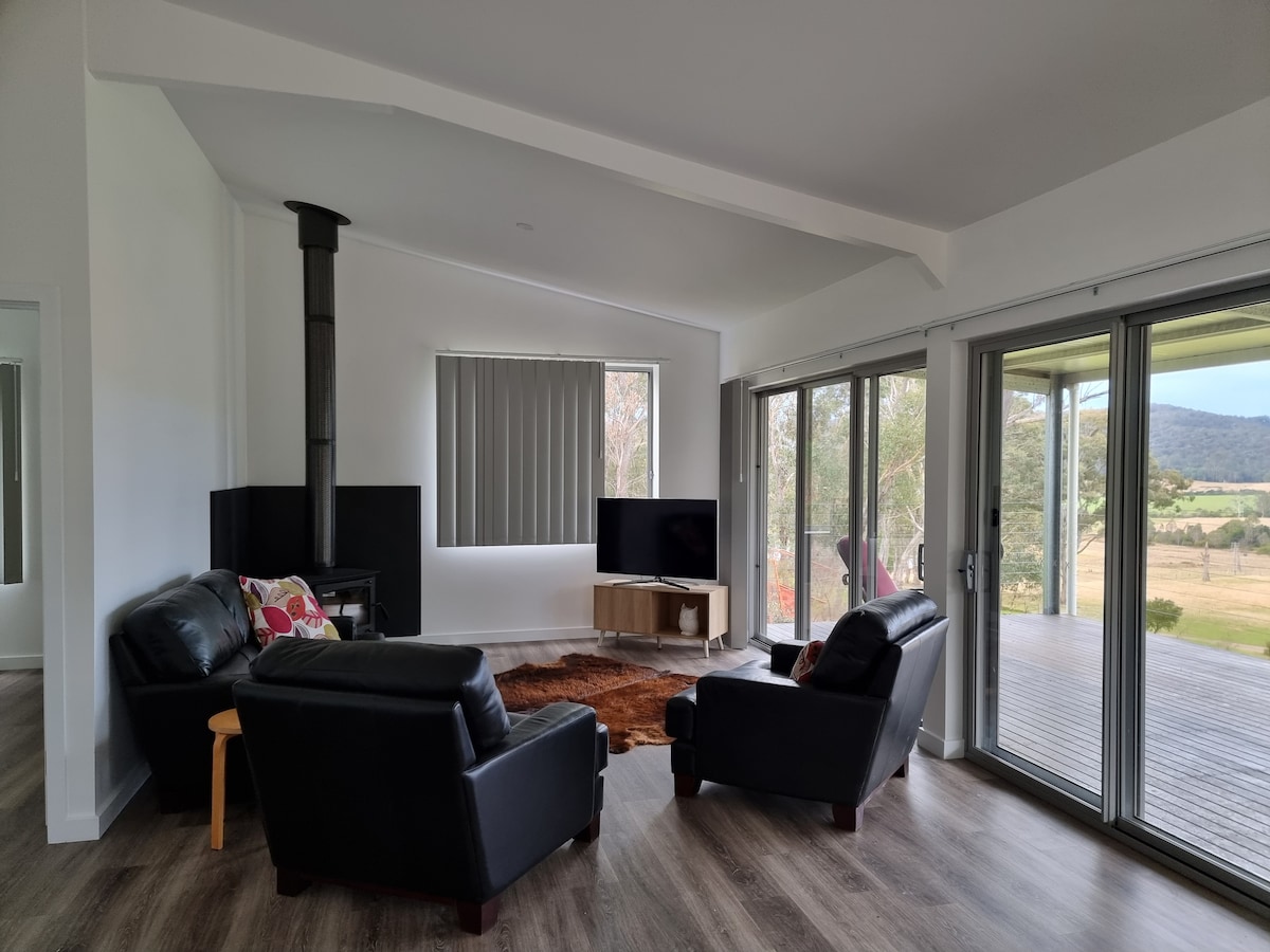 Viihtyisä auringon täyttämä 2 makuuhuoneen mutatiilimökki. NE-näkymästä on näkymä metsään, kaukaisille vuorille, kumpuileville kukkuloille ja laidunmaille. Rentouttava loma - mukava ja luova maalaistyylinen, jossa on taiteellisia yksityiskohtia. TV, Netflix ja ilmainen wifi. Hyvä mobiilivastaanotto. Sadevesisäiliö, avotakka, polttopuut saatavilla. Lemmikkiystävällinen, tarvittaessa turvallinen aitaus talon takana. Kauniit vakiintuneet puutarhat. Helppo pääsy pyörätuolilla. Majoita lähellä saadaksesi tarvittaessa paikallisia tietoja ja apua.