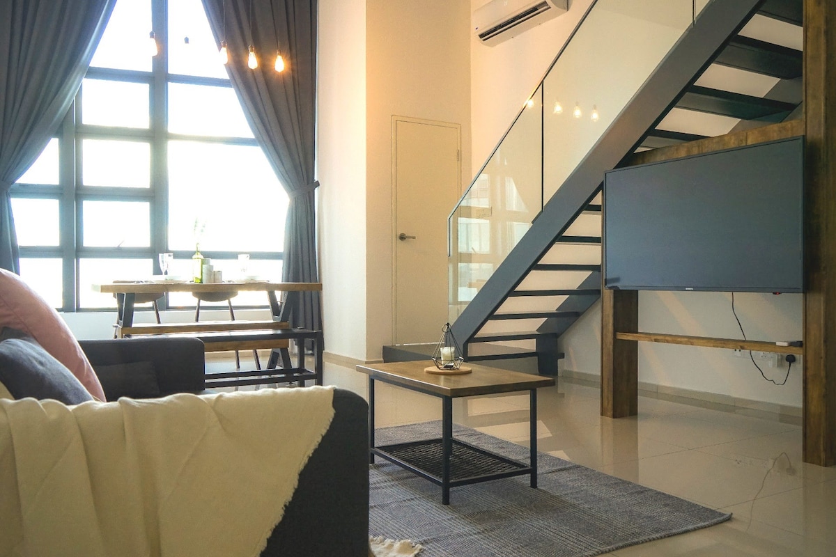Tervetuloa moderniin teollistyyliseen kaksikerroksiseen asuntoomme, jossa kaupunkimukavuus kohtaa tyylikkään designin. Tämä ainutlaatuinen tila on ihanteellinen enintään kuudelle vieraalle, ja se tarjoaa tyylikkään ja mukavan majoittumisen. Astu teollisuuden inspiroimaan keitaaseen, jossa on paljaat tiiliseinät, tyylikkäät metalliyksityiskokset ja nykyaikaiset kalusteet. Sisustus on sekä trendikäs että kodikas, mikä luo vieraanvaraisen ilmapiirin. Sieltä on suora pääsy EKO CHERAS MALL -ostoskeskukseen ja yhteys MRT-asemalle. Viehättävä valikoima kahviloita, baareja, ravintoloita ja vähittäiskauppoja.
