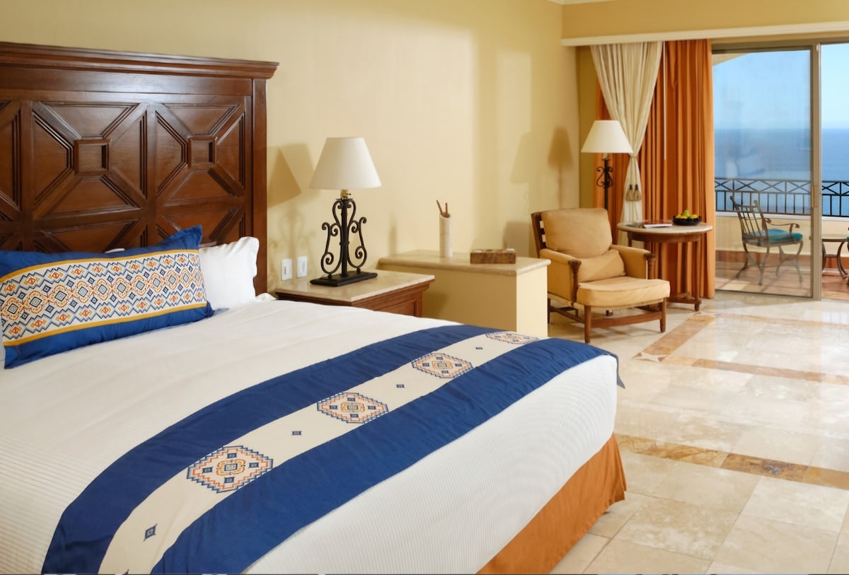 3 bedroom luxurious with Mexican culture. Steps off of famous Médano Beach, ocean views, View the Arches. Walk to Cabo Marina. Enjoy easy access to popular shops and restaurants from this charming place to stay. 5 Star resort with all amenities, Restaurants, bar, all inclusive packages available. Let us pick you up from the airport and make Paradise dreams come true. Room colors may vary. Mat request room location