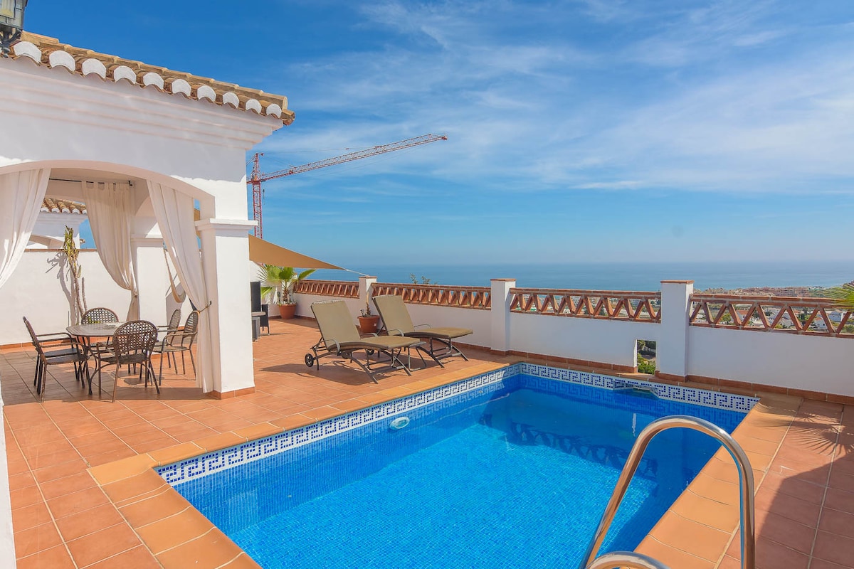 Suuri 4 makuuhuoneen talo sijaitsee El Peñoncillossa, Torroxissa. Välimeren näköalalla ja etelään päin. Upouusi, moderni, tanskalainen keittiö, lattialämmitys, ilmastointi ja paljon muuta.<br><br>Yksityisen talon lisäksi sinulla ja vieraillasi on pääsy seuraaviin:<br><br>Yhteinen uima-allas: <br><br>Suuri lämmitetty uima-altaamme on täydellinen paikka rentoutua ja nauttia upeista näkymistä Välimerelle.<br><br>