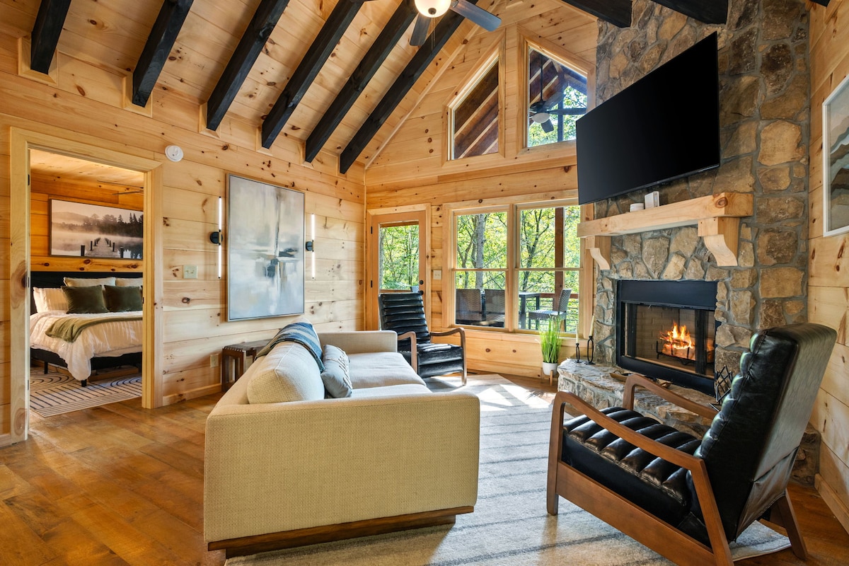 Serene 2BR/1Bath cabin on the Cartecay River. Enjoy 150 ft of private river frontage with a beach, rapids & fire pit. This light-filled 500 sq ft retreat features custom art, modern design & cozy details. Relax in the hot tub, watch a movie on the projector, or nap on the riverside bed swing. - Sleeps 4 | luxury linens + modern fixtures - Hot tub, bed swing, movie projector & outdoor fire pit - Direct river access for tubing & kayaking - Superhost care—always a message away