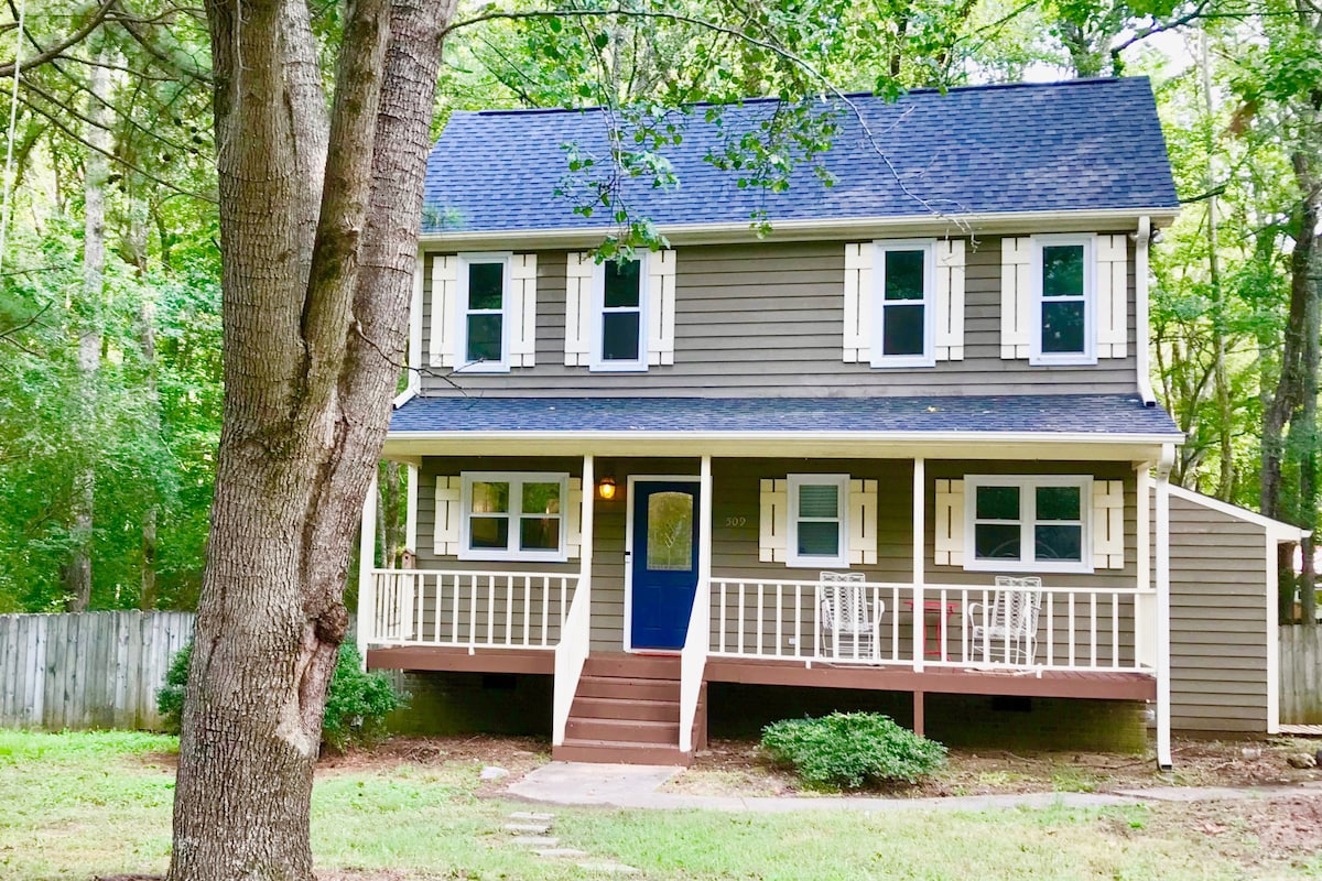 Rentoudu tässä viehättävässä naapuruston kodissa, joka on piilossa puiden siimeksessä. Tässä avoimessa mutta viihtyisässä mökissä on tilava kuisti ja lasiovet yksityisen takapihan terassille, ja se tarjoaa molempien maailmojen parhaat puolet. Sijaitsee 5 minuutin päässä Duke Regionalista ja Eno River State Parkista, lähellä Duke Universityä ja sairaalaa sekä Durhamin keskustaa. Tule rentoutumaan ja nauttimaan kaikesta, mitä Durham ja RTP tarjoavat. Tässä yksityiskohteessa on makuuhuone ja kylpyhuone ensimmäisessä kerroksessa sekä kaksi muuta makuuhuonetta ja kylpyhuone yläkerran.