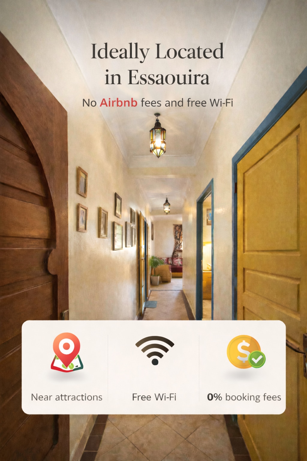 Lämmin ja viehättävä huoneisto Essaouiran vanhan medinan sydämessä! Asunnossa on 2 valoisaa makuuhuonetta, joissa on vuoteet, 2 yksityistä kylpyhuonetta, viihtyisä olohuone ja pieni mutta käytännöllinen amerikkalainen keittiö. Vain muutaman askeleen päässä soukeista, kahviloista ja rannalta. Nauti ultranopeasta valokuituinternetistä (jopa 200 Mbit/s), joka sopii täydellisesti etätyöhön tai suoratoistoon. ⚠️ Ei saatavilla naimattomille marokkolaisille pariskunnille.