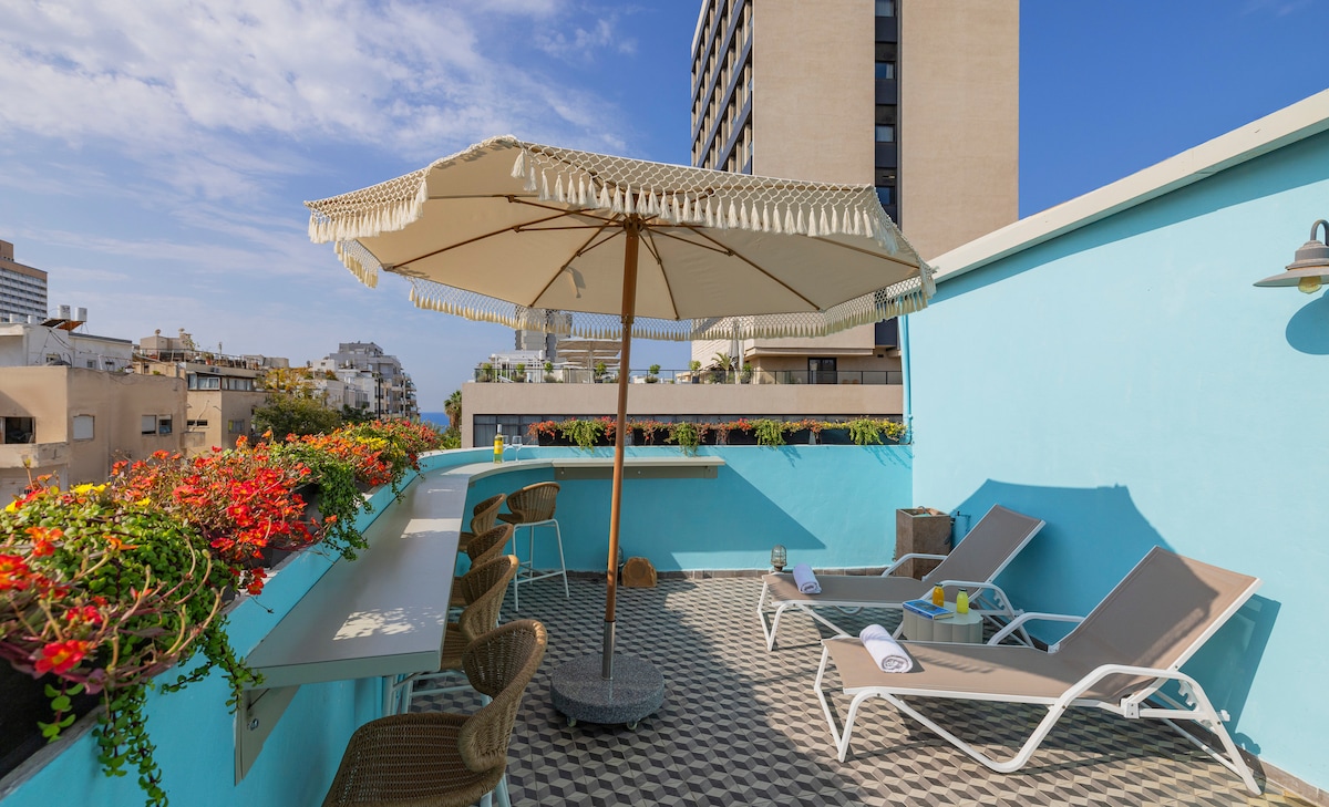 Luxurious Junior Suite PENTHOUSE Apartment on Tel Aviv 's most iconic street and within 5 minutes walk from the beach, this self-catering apartment is a perfect base for both families and business travellers, who are looking the comfort of hotel services such as daily house keeping and day time reception staff while having the privacy of a apartment. Sijainti on hämmästyttävä , keskellä kaupunkia ja muutaman minuutin päässä rannalta. Loputtomat ravintolat löytyvät kotiovellesi.