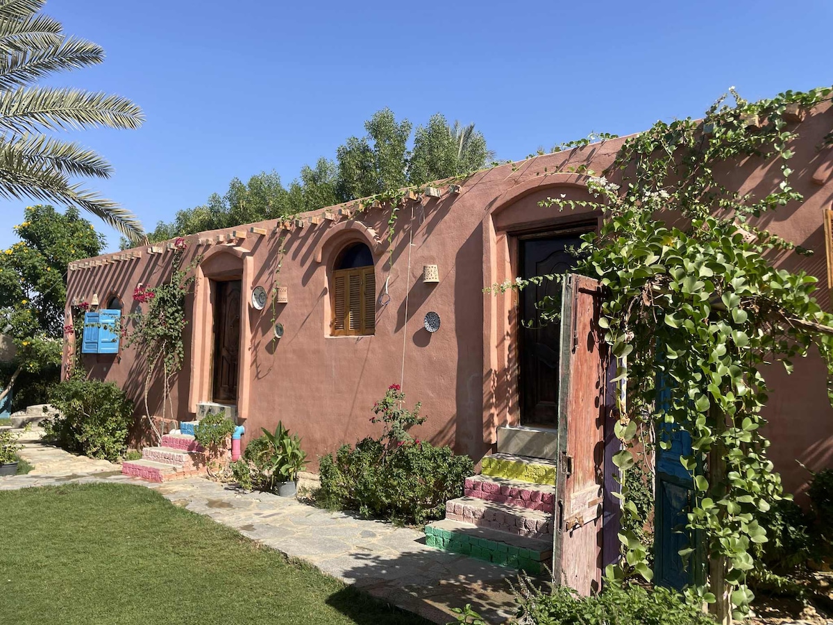 Mökki, jossa on 2 erillistä makuuhuonetta, yksityinen kylpyhuone ja puutarha, joka sijaitsee Fayoumin taidekeskuksessa Se voi sopia perheelle tai kaveriporukalle.