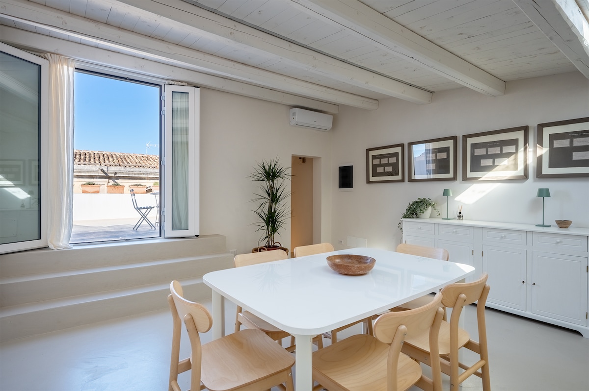 Tämä upea loft on syntynyt vanhan puusepänverstaan huolellisesta restauroinnista ja sijaitsee vain muutaman minuutin kävelymatkan päässä Noton katedraalista. Loft on jaettu kahteen tasoon, joista ensimmäisessä on suuri olohuone, jossa on avokeittiö ja keittiösaareke, jossa on kodinkoneet, sekä kylpyhuone, jossa on eteinen, wc ja kylpyamme. Toisessa kerroksessa on suuri makuuhuone, josta on näkymä arabialaiselle terassille, ja kylpyhuone, jossa on suihku peilillä peitetyn seinän takana. CIR 19089013C219169