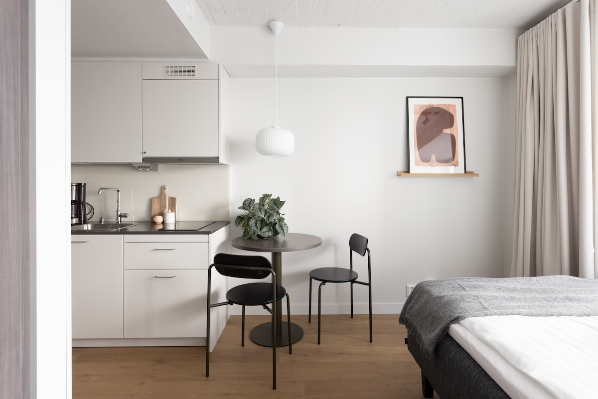 Astu täysin kalustettuun studioomme! Siinä on vuode, pöytä ja tuolit, kaapit, valaistus, perus kodinkoneet, pyykinpesukone, tekstiilit ja tarvikkeet. Keittiö, makuuhuone ja kylpyhuoneyhdistelmä tuovat tilaan nykyaikaisen ja modernin vivahteen. Valmis leviämään päiväksi, viikoksi tai kuukaudeksi – tämä studio on kotisi poissa kotoa. Tule sellaisena kuin olet ja ota kaikki irti majoittumisestasi!