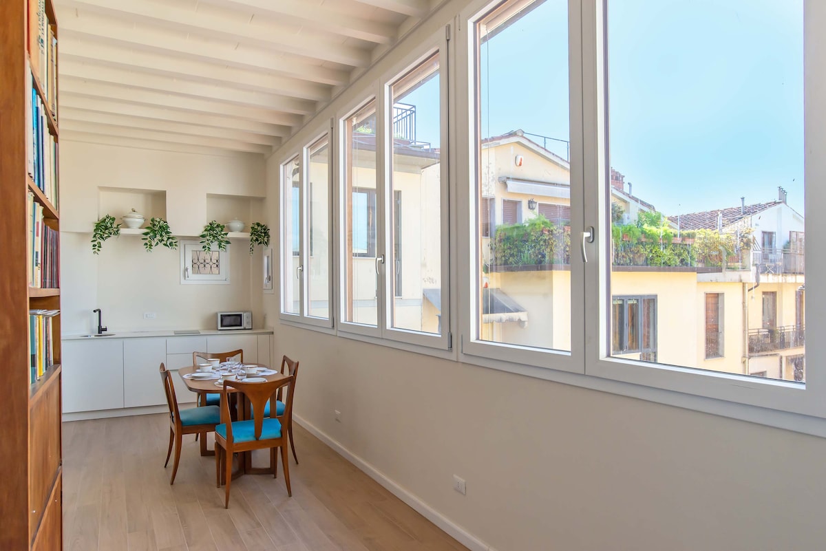 Avaa suuret lasiovet ja anna Toscanan yrttien tuoksun tulvia sisään. Astu terassille ja avaa Sangiovese-viini nauttiaksesi upeista näkymistä Duomoon. Tämä romanttinen kattoterassi sijaitsee Santa Crocen ja Sant'Ambrogion naapurustojen kattojen yläpuolella. Siellä on upouudet kodinkoneet, antiikkisia ja käsintehtyjä huonekaluja, kaksi kylpyhuonetta ja kaikki mukavuudet, joita tarvitset täydellisenä tukikohdana tutustuaksesi Firenzeen.