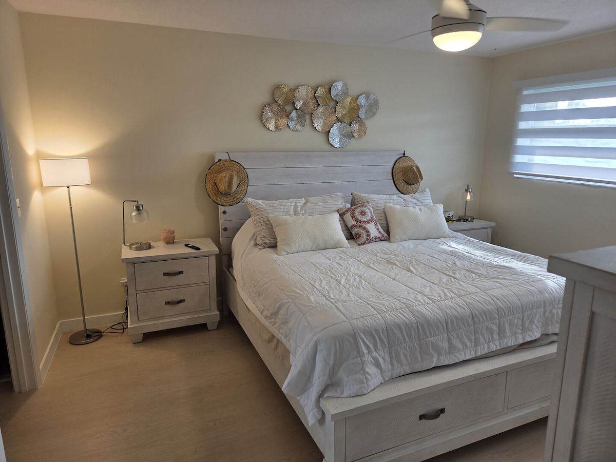 Tervetuloa South Hutchinsonin saarelle, Floridaan! Nauti kalastuksesta, lainelautailusta, rannoista, historiallisesta keskustasta ja maanviljelijöiden markkinoista. Hauskan päivän jälkeen voit rentoutua ylellisessä loma-asunnossamme, jossa on ilmastointi, suihku, jossa on hyvä vedenpaine ja king-size-vuode. Kokoonnu suurelle poikkileikkaussohvallemme ja katso elokuva 70-tuumaisesta älytelevisiosta. Valmista ruokaa kotona tai kokeile lähellä olevia ravintoloita. Sijaitsee ystävällisessä naapurustossa Treasure Coastilla.