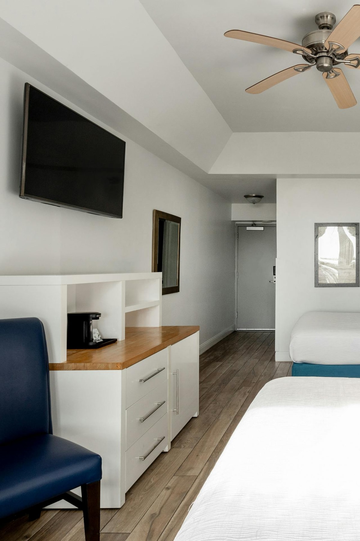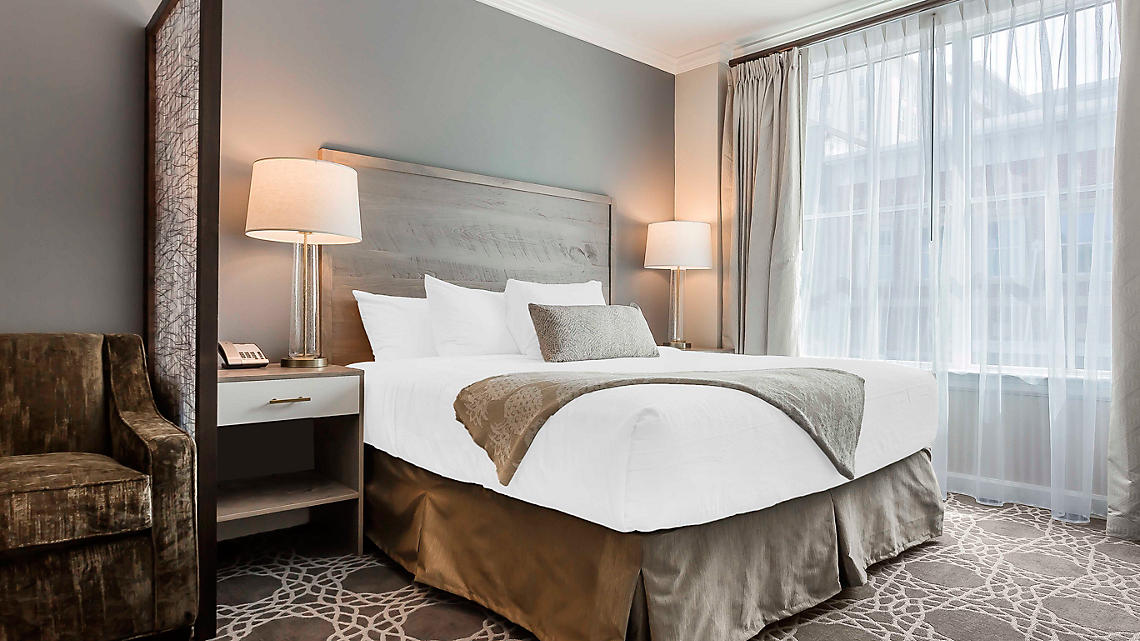 Our King Guest Room is perfect for the adventure-seeking guest looking to make the most of their stay out on the town. Intimate in size, this room will surely transport you to a good time state of mind. Featuring a walk-in shower, a writer’s desk, plush linens, and cozy robes, this well-appointed guest room has everything you need, nothing you don’t.