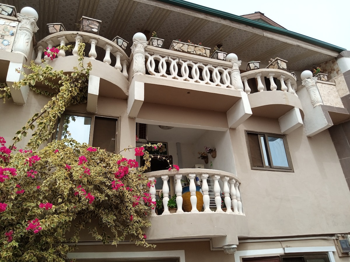 Rentoudu koko perheen kanssa tässä rauhallisessa ja kauniissa kukkulan laella sijaitsevassa huoneistossa, josta on upea näkymä Accraan. It 's set in Kwabenya Hills surrounded by nature and the chirping sound of birds. Se sijaitsee hyvin suojatussa naapurustossa, jossa on valvontakamerat, sähköaita, VARAVIRTA ja vartija turvallisuutesi takia. Huoneistoissamme on myös DSTV (yli kuukauden kestäville varauksille), joten et menetä suosikkitelevisiokanaviasi. Meillä on myös KUUMAT SUIHKUT