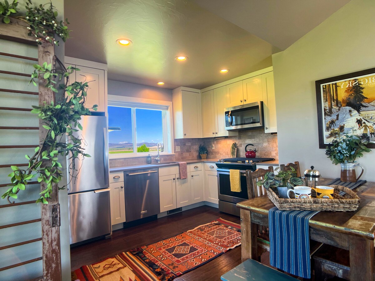 HIHDA Big Sky ja Bridger! Olemme niiden välissä. Aito uudistettu maalaistalo, erittäin mukava. Se on 21 eekkerin alueella, jota ympäröi viljelysmaa. Soratiellä umpikujalla. Erittäin hiljainen. Tähtien katselu! 12 mailia Bozemaniin ja 30 Big Skyhin. 2 makuuhuonetta (yksi queen-vuoteella ja kaksi yhden hengen) voidaan jakaa tai käyttää yhtenä sviittinä. Makuuhuone on pyörätuolille sopiva. 1889 Barn sijaitsee kohteessa! Se on taidegalleria, pieni tapahtumapaikka ja baari! Voin jättää sinulle ruokaa JA alkoholia. TheWayToYourHeartbiz