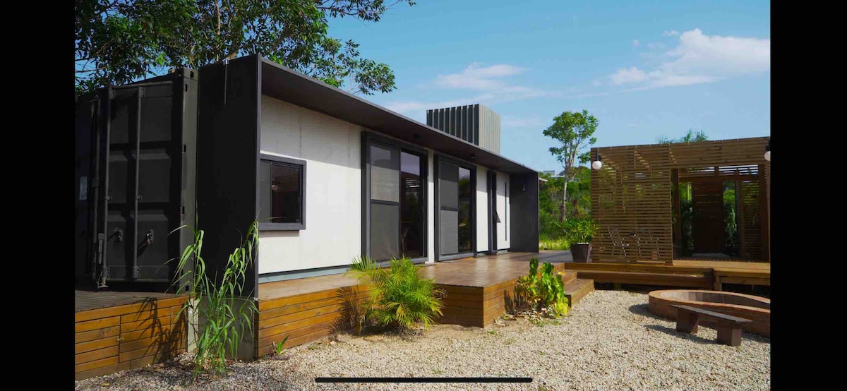 Minitalomajoitukset, joiden ulkopuolella on istuskelualue