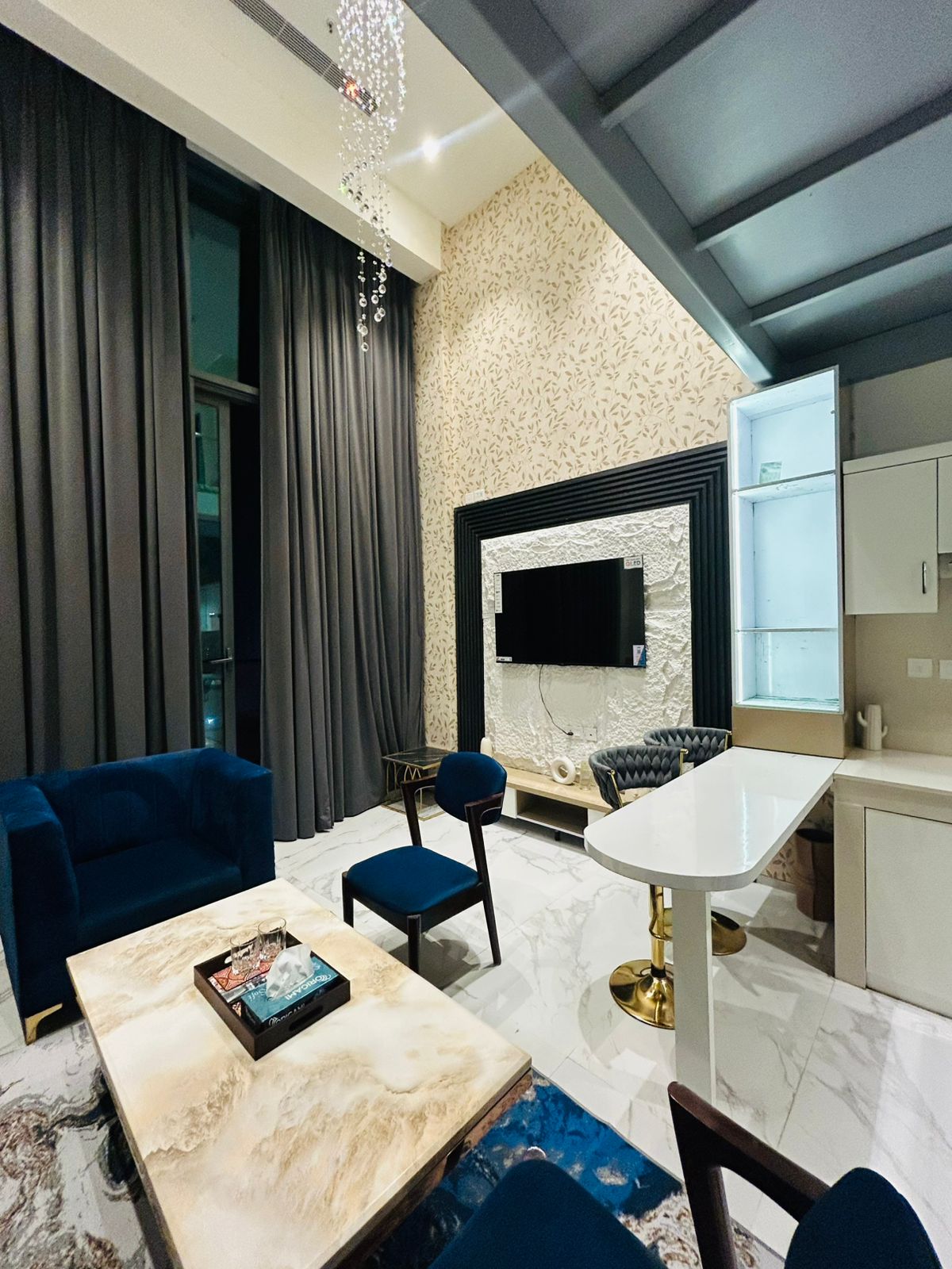 Tervetuloa ylelliseen urbaaniin studioomme, tyylin ja hienostuneisuuden keitaaseen Gurgaonin vilkkaassa sydämessä. Loftimme erottuva piirre on erityinen musta värimaailma, joka lisää tilaan ripauksen eleganssia ja draamaa, mikä tekee majoittumisestasi mukavan ja upean. Kun astut tyylikkäästi sisustettuun studioomme, sinut tervehtii näky pehmeistä mustista nojatuoleista. Nämä kaksi ylellistä nojatuolia ovat keskipisteenä ja tarjoavat täydellisen yhdistelmän nykyaikaista muotoilua ja poikkeuksellista mukavuutta.